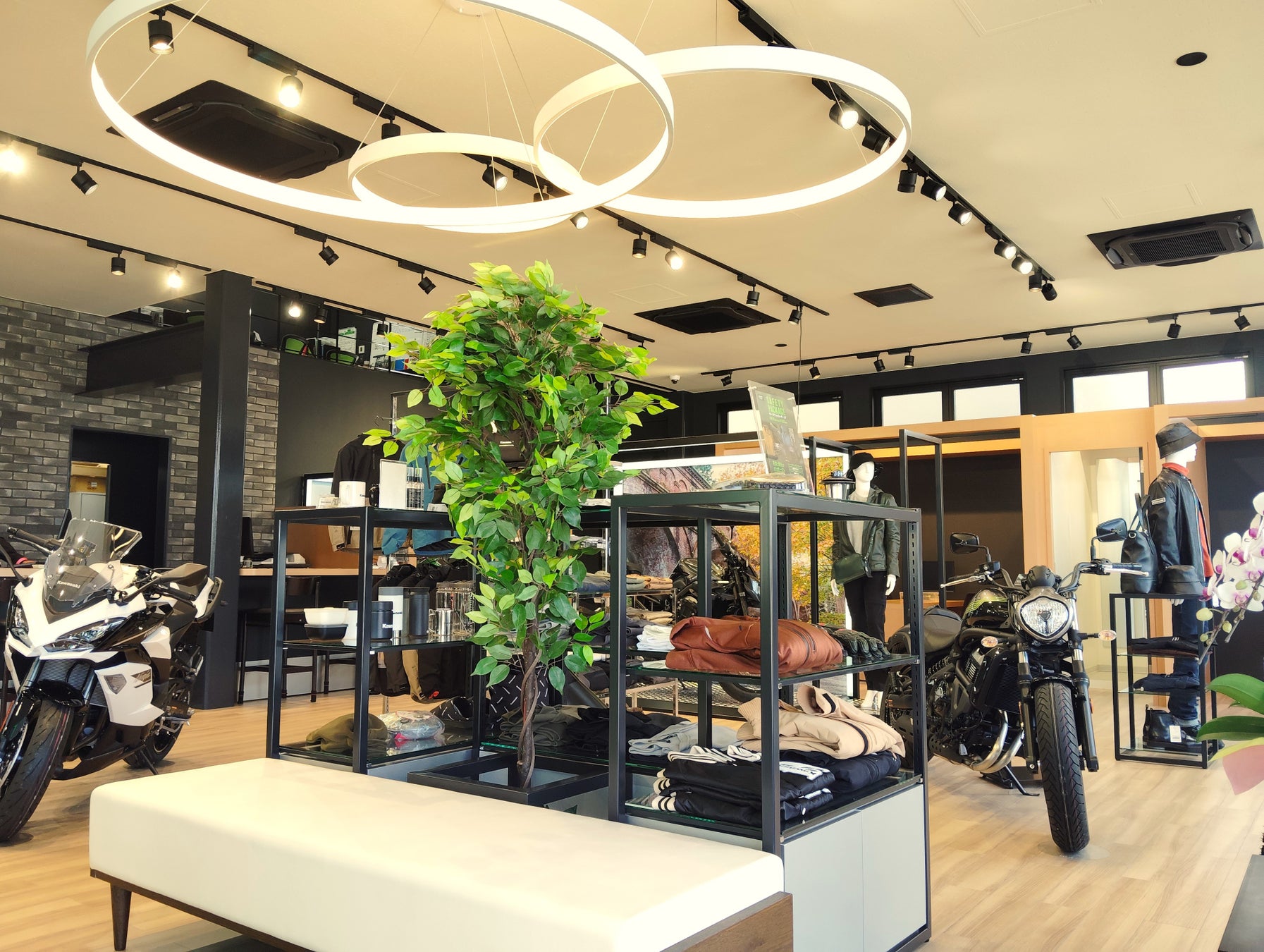 木目調のフロアと白い天井が織りなす明るい店内。モーターサイクルとプラザアパレルがゆったりと展示され、どなたでも楽しめる空間となっています。