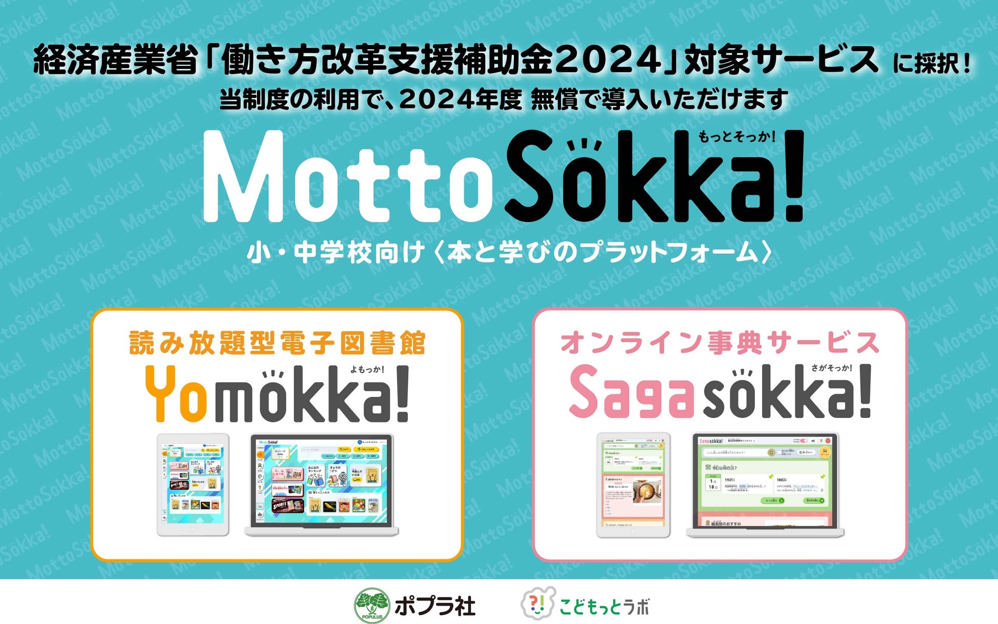 この度、株式会社ポプラ社が、本と学びのプラットフォーム『MottoSokka!(もっとそっか!)』を通じて提供する小・中学校向けの読み放題型電子図書館『Yomokka!(よもっか!)』と、オンライン事典サービス『Sagasokka!(さがそっか!)』が、経済産業省による「働き方改革支援補助金2024」の対象サービスに採択されました。