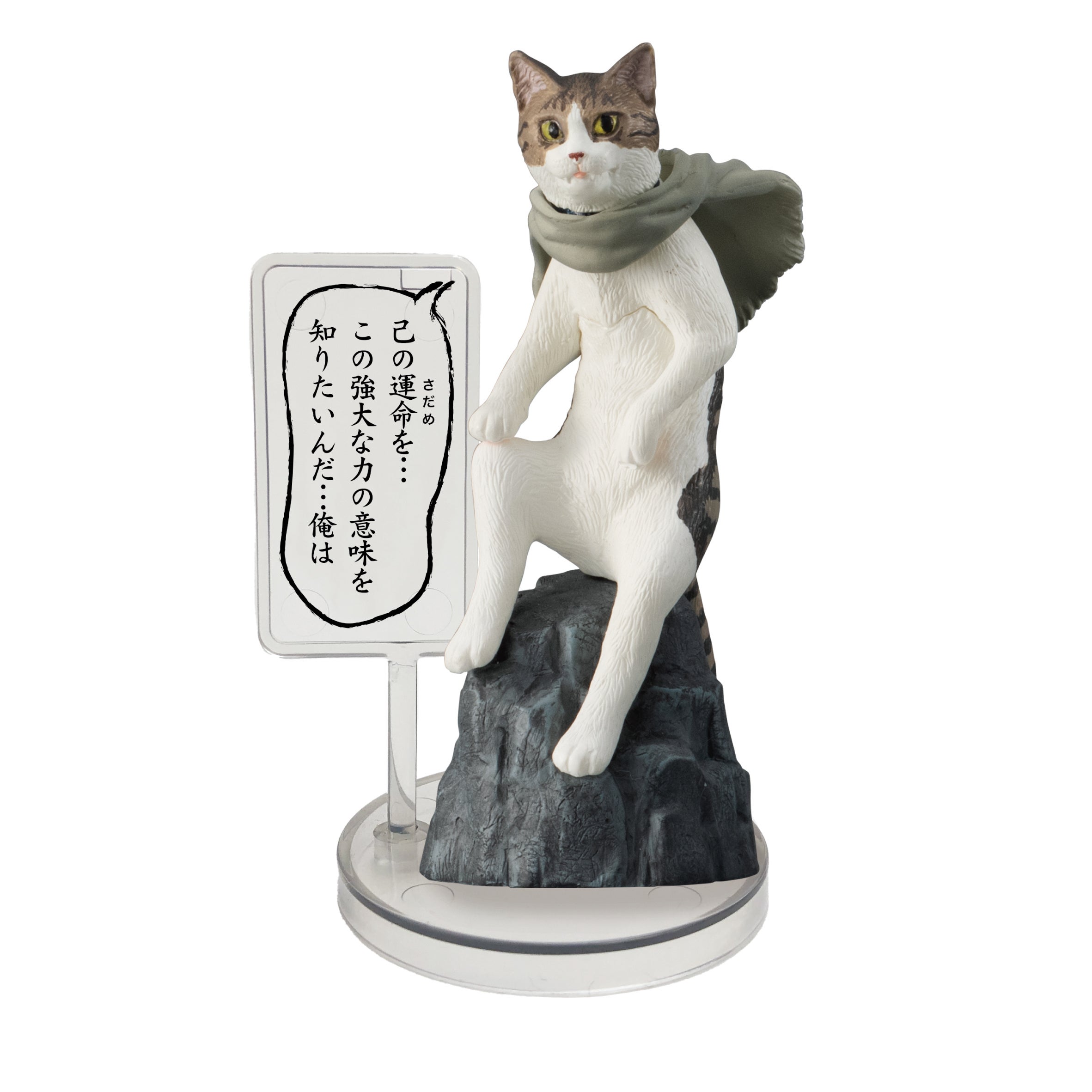 厨二猫(ちゅうにびょう)、彼らは中学二年生にありがちな妄想と思い込みの世界に生きる猫達である!永遠の中学二年生…暗黒のマイワールドに浸りきった彼らの生き様を立体化した愛と青春のフィギュアコレクション全種新規造型の第二章開幕…!意外とビッグサイズ&それっぽいセリフの台座もついて、なんだかとってもお買い得!台座だけでも遊べちゃうかも?!さぁ…再び集めるのです…