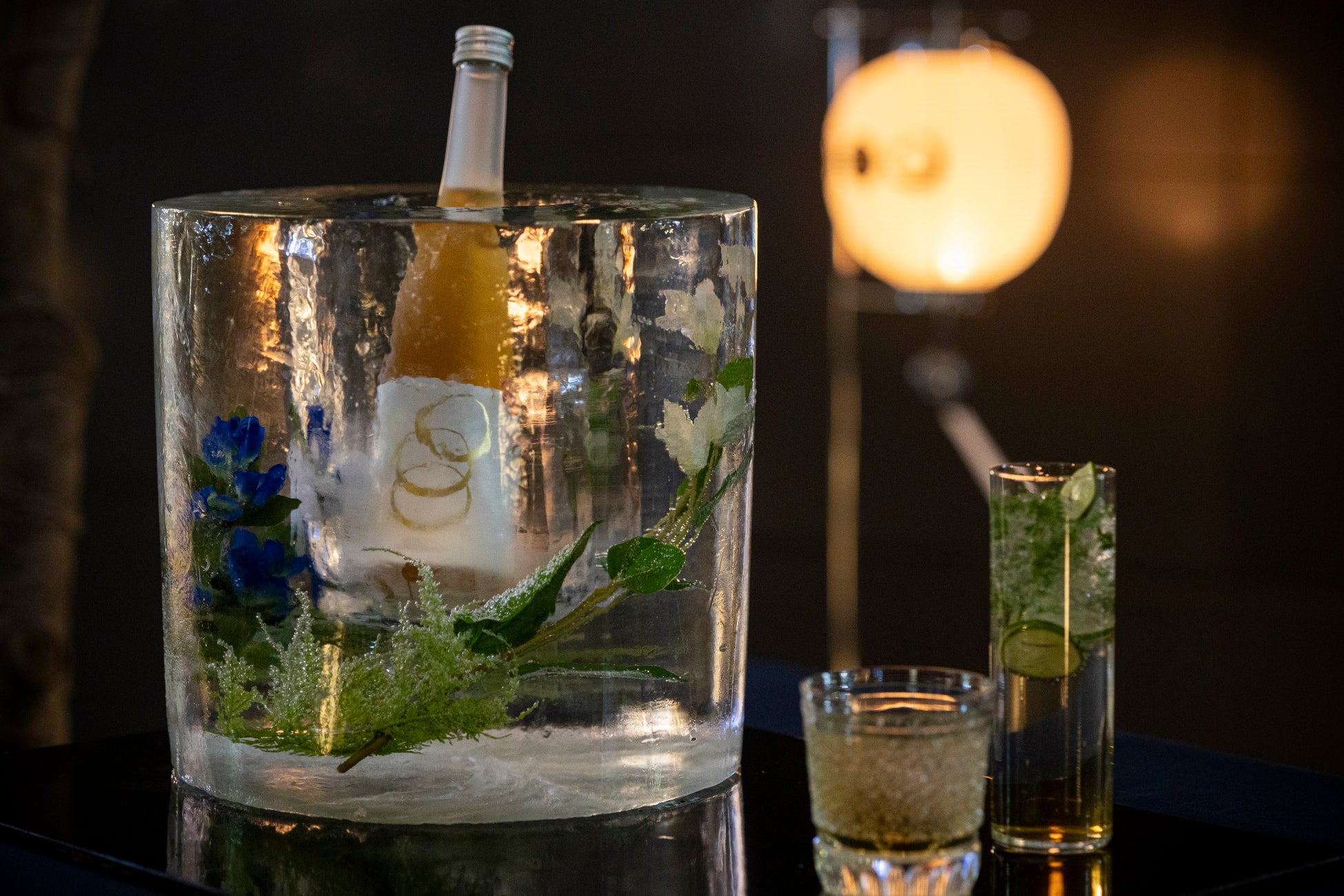 「大川(隅田川)の涼み」が夏の風物詩だった江戸時代、人々は暑さを凌ぐために、舟に乗って夏の宵を過ごしていました。その風習に倣い、本プログラムでは、宵涼みを楽しめる舟上の「涼み席」を用意します。足を伸ばして寛げる涼み席で提供するのは、みりんを使ったカクテルです。江戸時代には、みりんを焼酎で割った「本直し」を暑気払いの栄養補給として飲む風習があったと言われています。(*2)目で凉を感じていた江戸の人々の知恵を借り、夏の草花で作った花氷のワインクーラーにみりんを用意します。東京の景色を眺め涼やかな風にあたりながら、スタッフが作ったオリジナルカクテルを楽しむ、宵のひとときです。