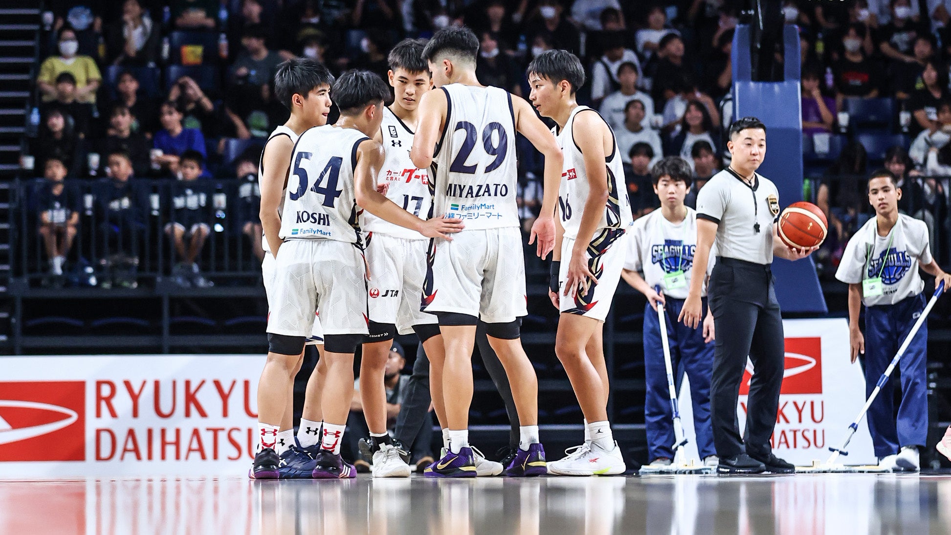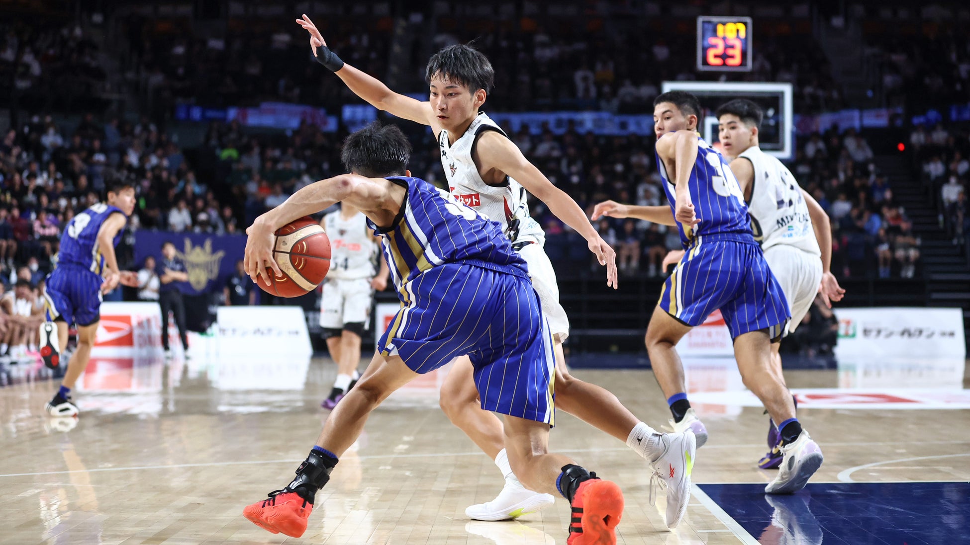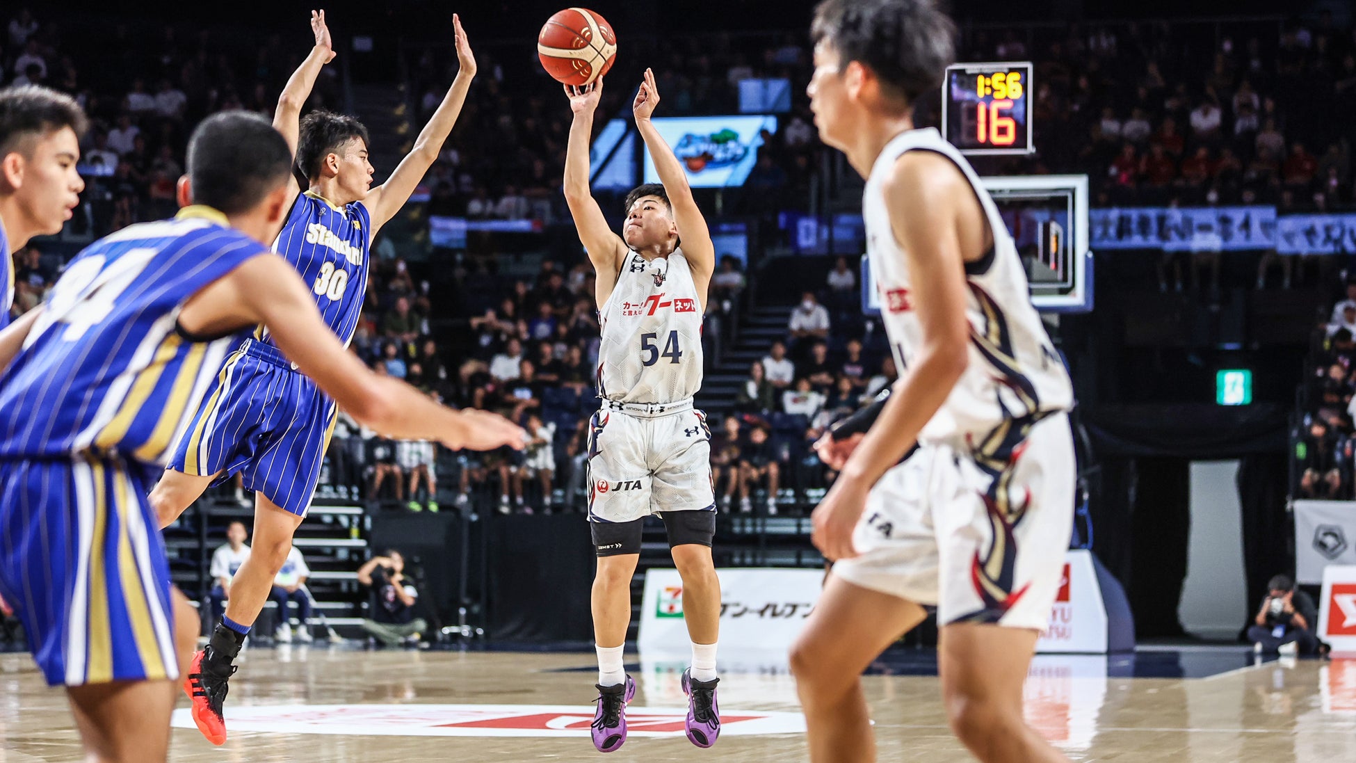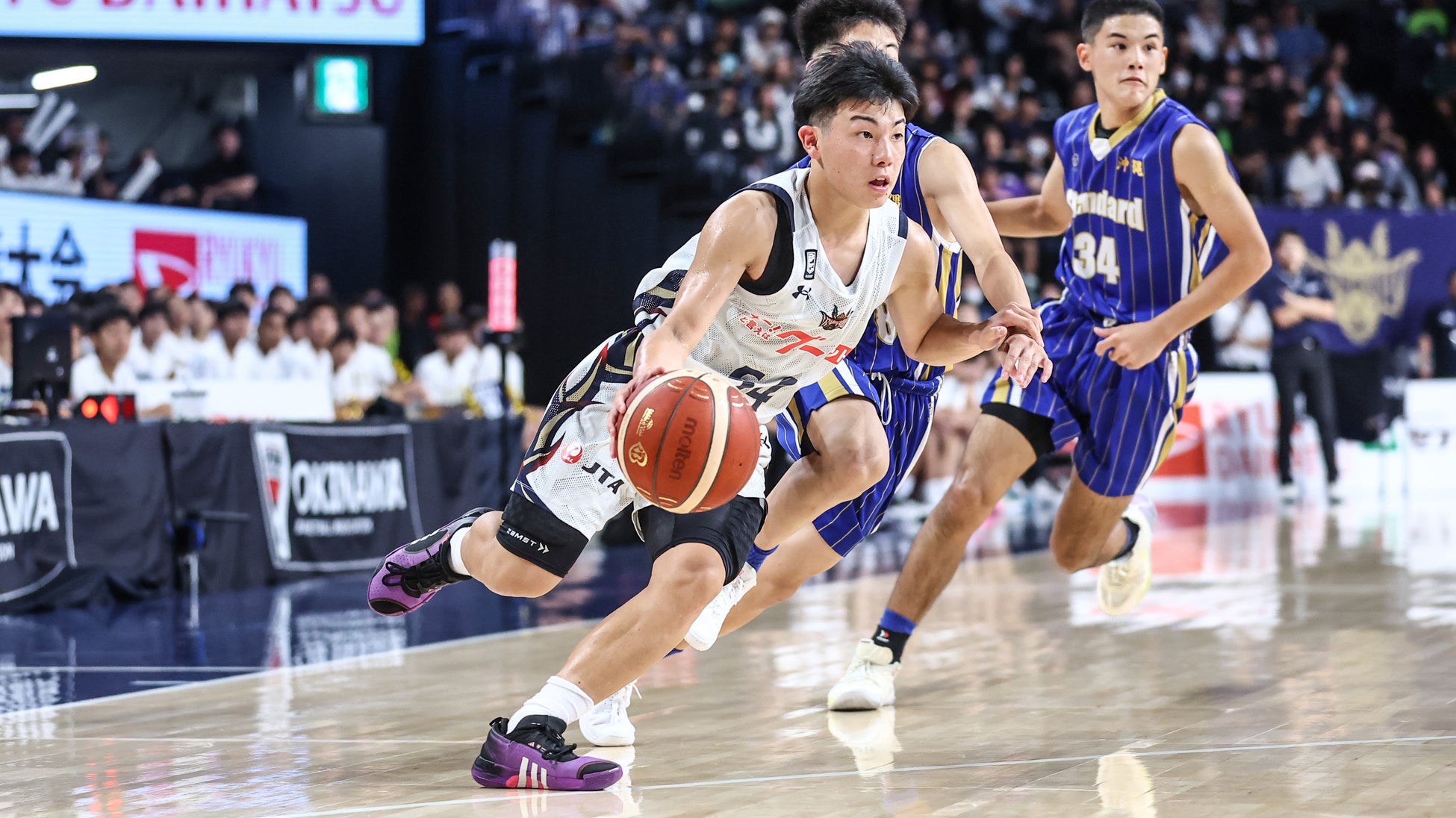 Jr.ウインターカップ出場権を懸けたStandardとの決勝戦。試合の序盤から強度の高いディフェンスで約3分間、互いに得点が停滞します。#29 宮里俊佑選手がゴール下で2Pシュートを決め、#54 越圭司選手が遠い位置から3Pシュートを射抜くと、#29 宮里選手がペイントへアタックして2Pシュートを沈めます。さらに#54 越選手の連続得点で得点を重ねるも、Standardは高確率で3Pシュートが決まり、拮抗した展開に。#56 友寄快星選手がリバウンドをねじ込み、17-15で1クォーターを終了します。