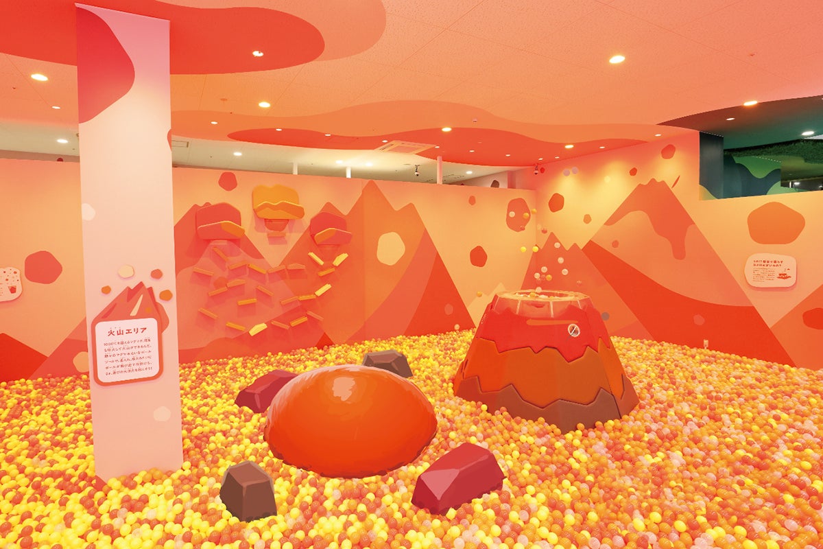 マグマが噴火する火山をイメージしたエリア。ボールが飛び出す火山や玉入れがあるボールプールで、思いっきり体を動かしてエネルギーを発散!ジャンプするのが楽しい岩をかたどった、新しい遊具「岩バウンサー」も登場します。