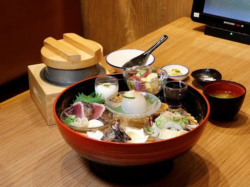 龍神丸の看板メニュー「鰹のたたき」は高タンパク低脂肪&低糖質の食材です。特にビタミン12の含有量はトップクラスで、これからの暑い季節、貧血予防にも期待が持てます。そして、ビタミンCと一緒に食べると肌に良いとも言われているため、ビタミンCが豊富な「日向へべす」を使ったデザートもセットに。こちらは鈴鹿市の老舗和菓子屋の大徳屋長久がこのメニューのために特別に作ってくれました。