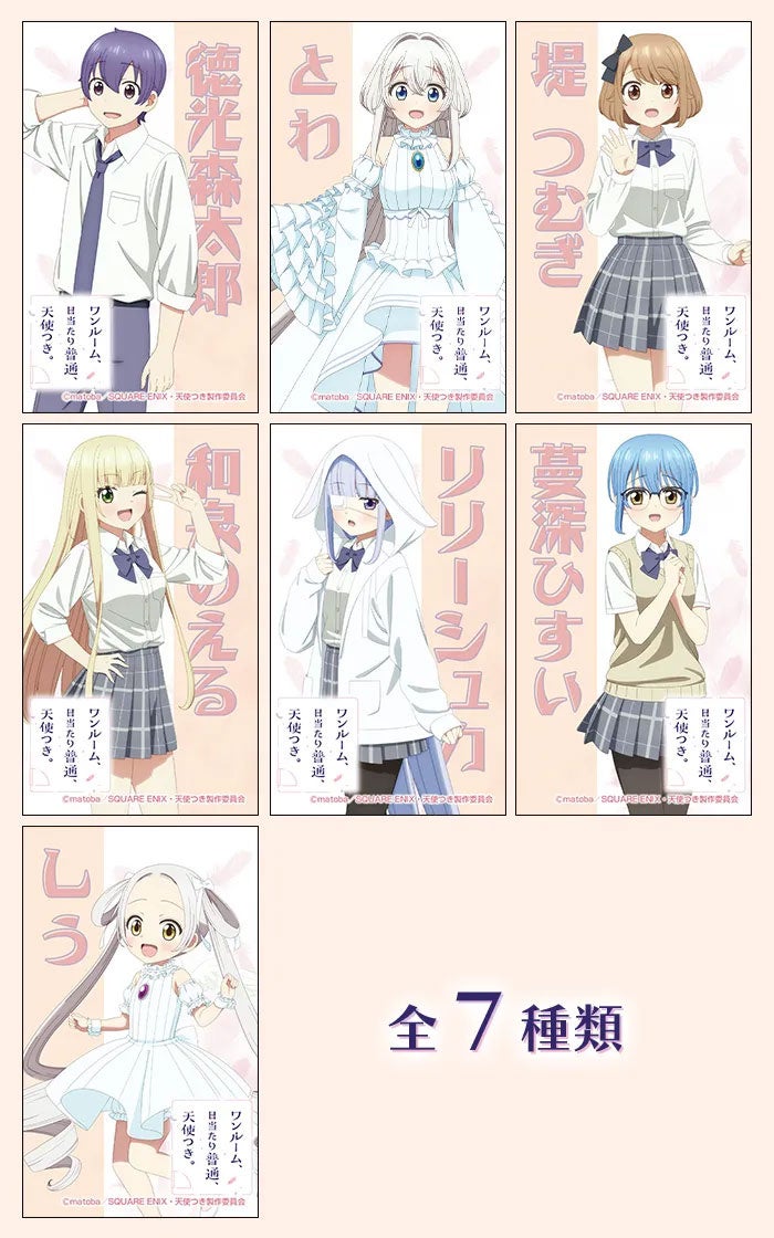 CURE MAID CAFÉ店内や同フロア、ジーストア・アキバにて「ワンルーム、日当たり普通、天使つき。」関連商品を2,000円(税込)ご購入・ご予約ごとに、カフェで配布しているイラストカードをランダムで1枚お渡しします。コラボカフェと合わせてご利用ください。