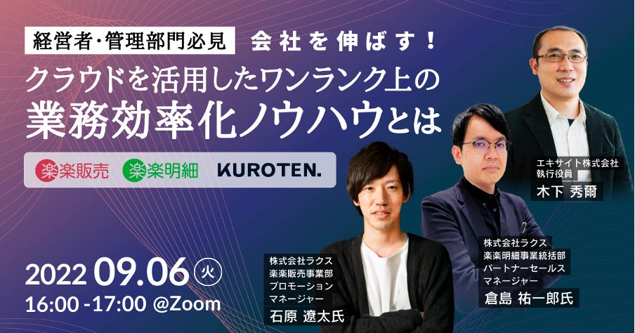 エキサイト株式会社(所在地:東京都港区、代表取締役社長:西條晋一)は、株式会社ラクス(所在地:東京都渋谷区、代表取締役:中村崇則)楽楽販売事業部プロモーション マネージャー の石原遼太氏、楽楽明細事業統括部パートナーセールス マネージャーの倉島祐一郎氏を迎え、2022年9月6日(火)16:00より「会社を伸ばす!クラウドを活用したワンランク上の業務効率化ノウハウ」をテーマに参加費無料のウェビナーを開催することをお知らせします。