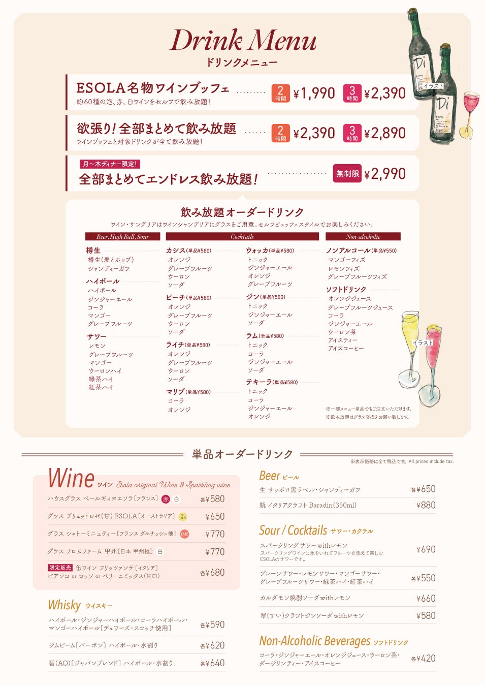 「ESOLA」では、常時60種類以上の赤・白ワイン、スパークリングワイン、サングリアをご用意しております。時間無制限で飲み放題の【ワインビュッフェ】が人気ですが、お酒やワインが苦手な方もお楽しみいただけるようノンアルコールやカクテルも種類豊富にご用意!会社での集まりや歓送迎会にも最適です。