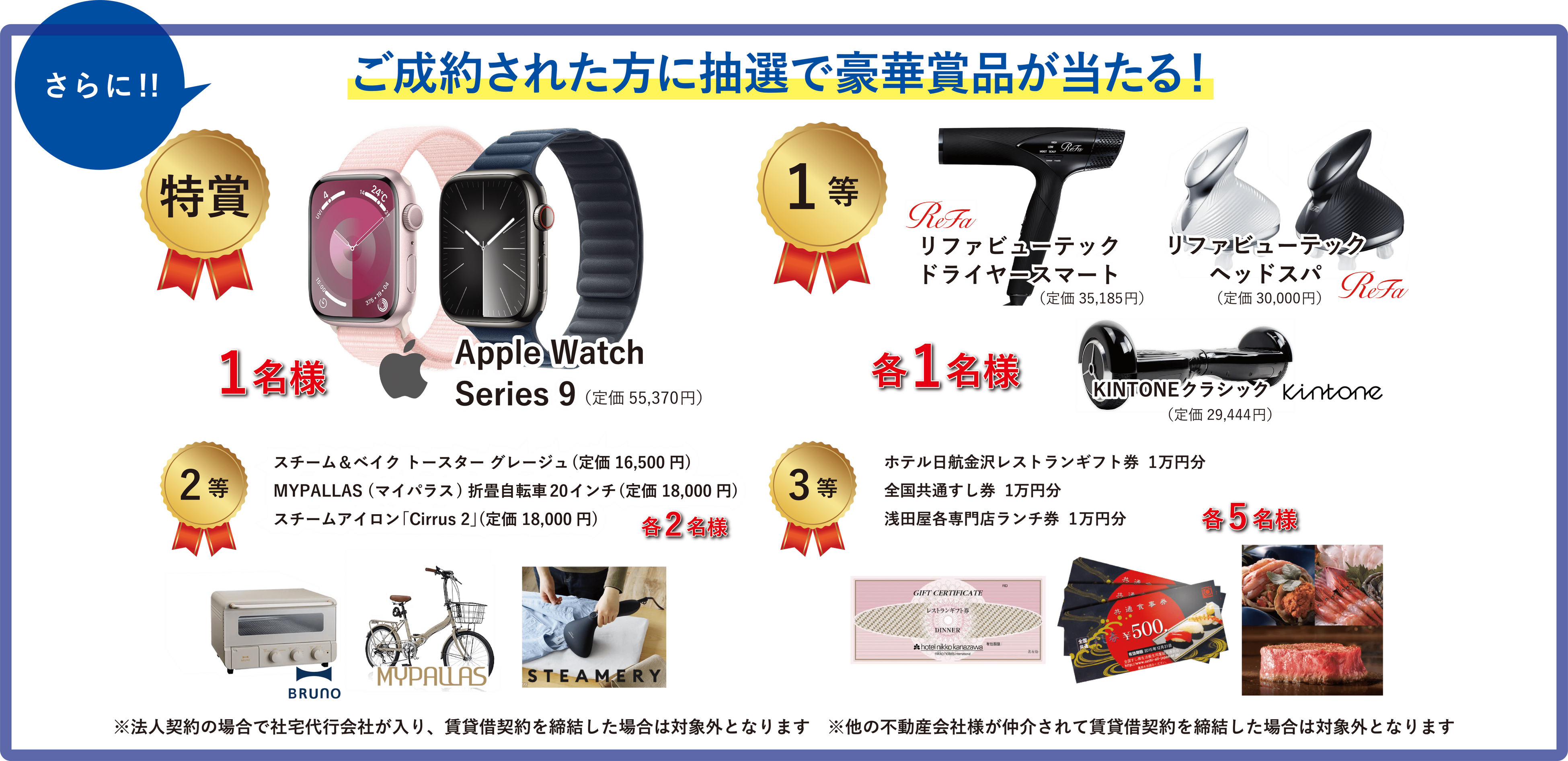 このキャンペーンでは、賃貸物件のお部屋探しで来店された先着850名様に賞品が当たるとともに、期間内に成約されたお客様を対象に総額100万円分の豪華賞品が抽選で当たるキャンペーンとなっております。
