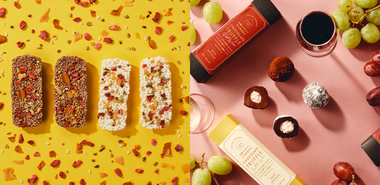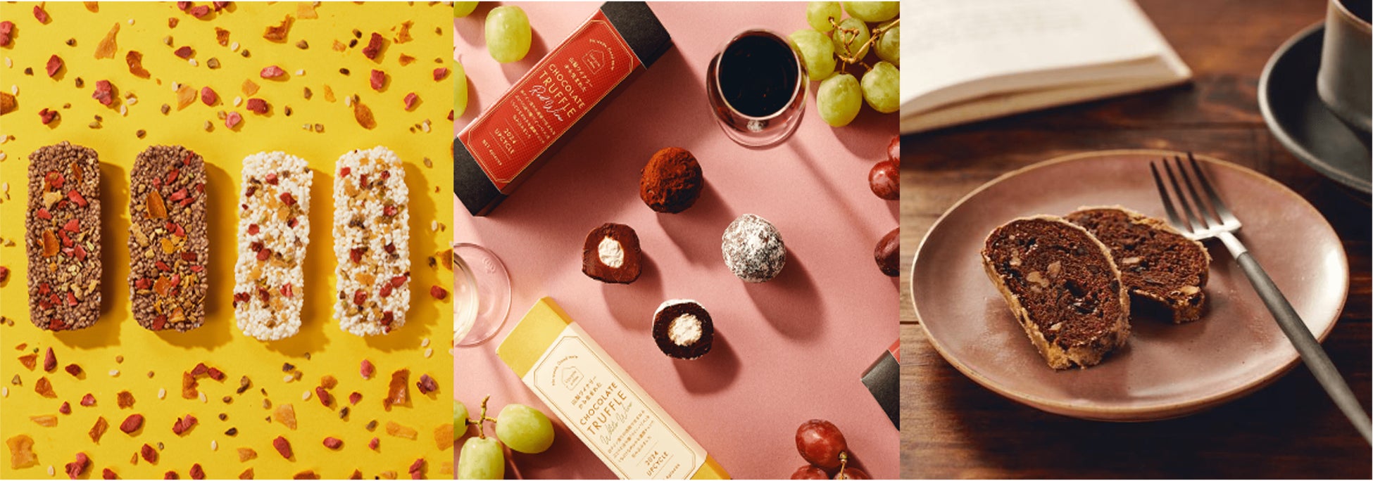 ▲(左)「フルーツで彩る アップサイクルクランチバー(ミルクチョコ)」「フルーツで彩る アップサイクルクランチバー (ホワイトチョコ)」、(中)「山梨ワイナリーから生まれた 濃厚生チョコトリュフ(赤)、(白)」、(右)「梅酒から生まれた 濃厚ショコラシュトレン」