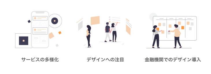 VUCA時代※2、金融業界においてもさまざまなプレイヤーが台頭、多くのサービスがリリースされ、ユ ーザーにとって選択肢が多様にある状態です。ユーザーに選択され使われ続けるサービスを設計するための手段として、デザインが注目されています。特許庁による「デザイン経営宣言」※3や、デジタル庁が掲げる政策の一つにも国民目線でのデザインや専門人材の採用が掲げられています※4。また、メガバンクが行内にデザイン組織を設置しアプリの再設計を主導する事例や、サービス検討時からデザイナーが携わるデジタルバンクの登場など、金融機関などでもデザイン思考・デザイン人材を活用する動きが出ています。