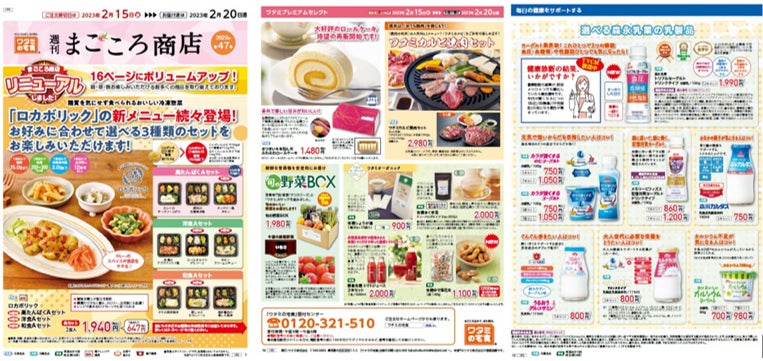 ワタミ株式会社(本社:東京都大田区、代表取締役社:渡邉 美樹、以下「ワタミ」)は、食事宅配サービスを行う「ワタミの宅食」にて、主力商品である冷蔵のお弁当・お惣菜を毎日お届けするとともに、「まごころ商店」という冊子を配布し、週に1回決まった曜日に、朝食や昼食に便利な一品もの惣菜や麺などの単品商品、また、森永乳業の乳製品、保存ができる冷凍惣菜などをお届けしています。この度、「まごころ商店」が2023年2月20日週より8ページ構成から16ページ構成になり、大幅に商品を拡充いたします。「ワタミの宅食」では、お客さまの暮らしにより寄り添った商品をお届けするとともに、日本各地の物産品や行事に因んだ商品、季節の食べ物を充実することでお客さまの食生活に彩りを加えてまいります。また、お客さまそれぞれの健康の悩みに沿った健康商品を取りそろえることで今まで以上にお客さまの健康維持に寄与してまいります。