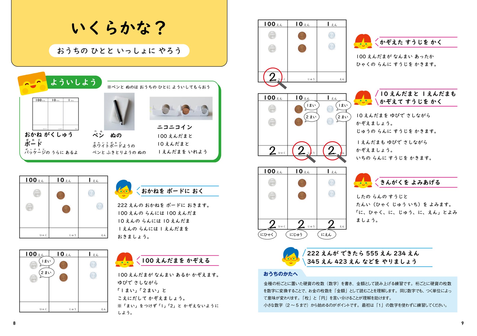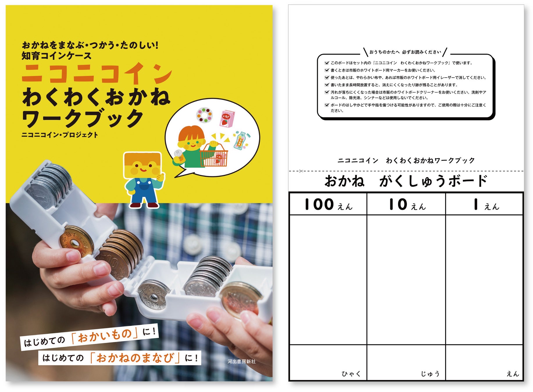 しかし、何から教えたらよいのか分からないという親御さんのために、楽しい知育教材セット『ニコニコイン わくわくおかねワークブック』を発売しました。