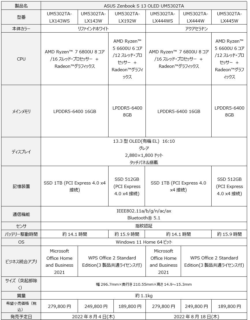 本日発表しました製品はすべてオフィスアプリが付属しております。型番UM5302TA-LX143WSとUM5302TA-LX444WSおよびUP5302ZA-LX157WSとUP5302ZA-LX206WSには、Microsoft Office Home and Business 2021が付属します。プライベートからビジネスシーンまであらゆるシーンで使用することが可能です。Microsoft Office Home and Business 2021は、Word、Excel、PowerPoint、Outlook、OneNoteを利用可能で、コラボレーションツールを使用し、複数のメンバーと同時に共同作業ができるなど、最新の機能が搭載されています。