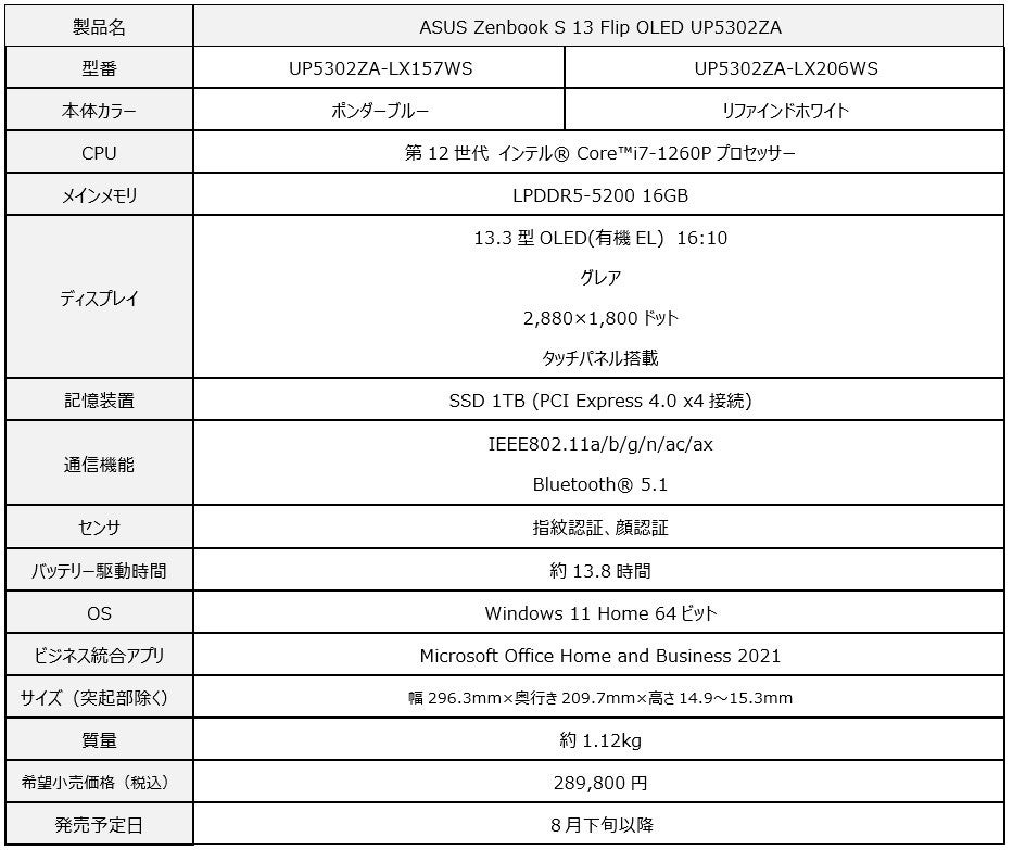「ASUS Zenbook S 13 OLED UM5302TA」は強力なグラフィックス機能であるAMD Radeon™ グラフィックスを内蔵するAMD Ryzen™ 6000シリーズ プロセッサーを搭載し、軽さ約1.1kgと最薄部の薄さ14.9mmの圧倒的なサイズ感を実現しており、持ち運びにも最適で、どこで作業をしても高い生産性を維持することができます。「ASUS Zenbook S 13 Flip OLED UP5302ZA」は従来のデスクトップパソコンをも凌ぐ高いパフォーマンスをノートパソコンにおいて叶える第12世代インテル® Core™ i7 プロセッサーを軽さ約1.12kgのコンパクトな筐体に搭載し、日常の作業やマルチタスクもより高速に、快適にこなします。