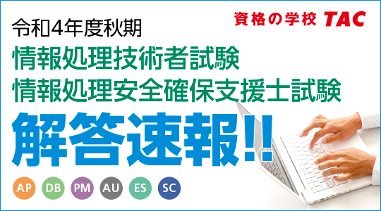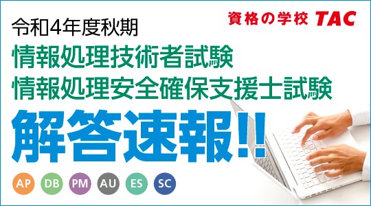 資格の学校TACが、10/9(日)に実施される「令和4年度秋期 情報処理技術者試験・情報処理安全確保支援士試験」の解答速報を、10/11(火)より順次TACホームページで公開いたします。