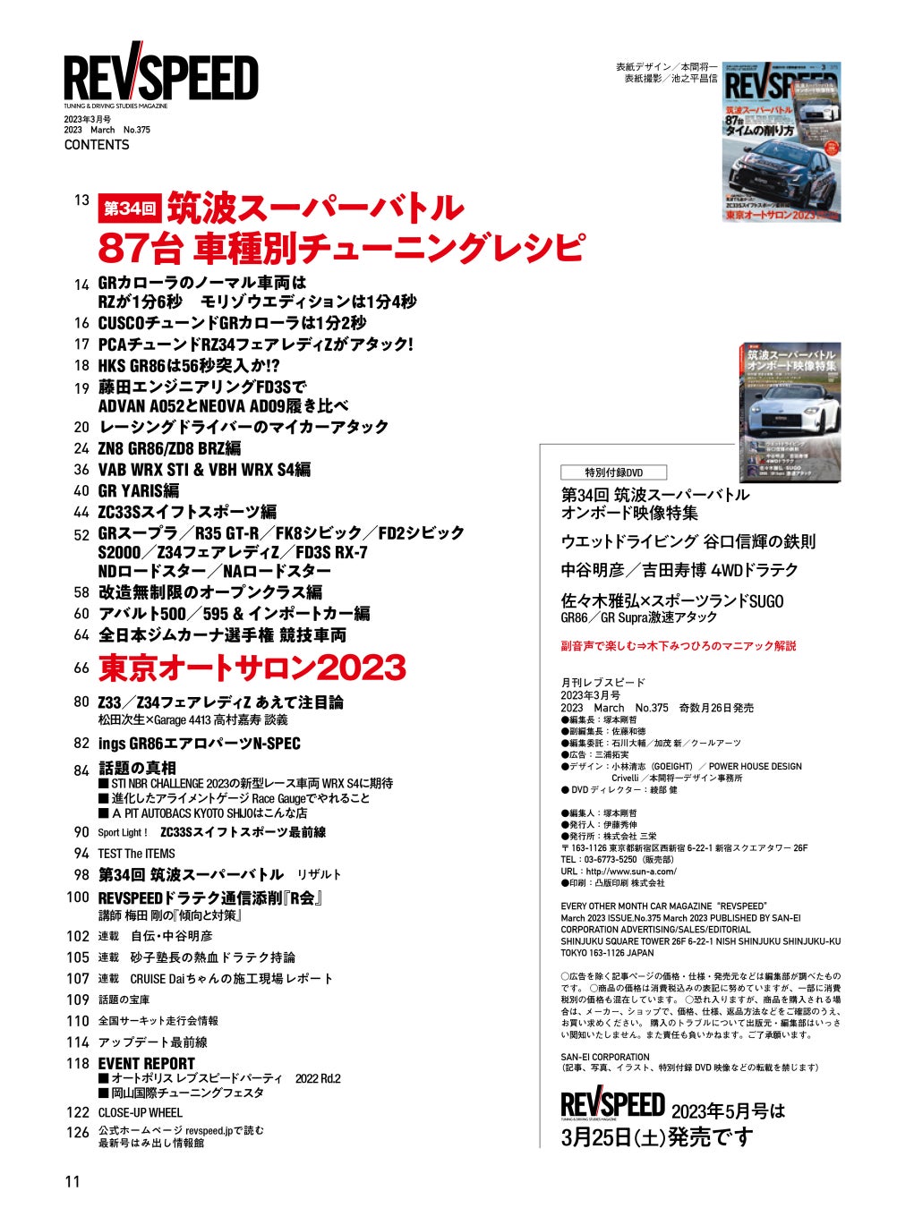 株式会社三栄(本社所在地:東京都新宿区、代表取締役社長:伊藤秀伸)は、2023年1月26日より『REVSPEED(レブスピード) 2023年3月号』を発売いたします。チューニングカータイムアタックの祭典『第34回 筑波スーパーバトル』を大特集。出走87台のチューニングレシピを誌面およびWEB(revspeed.jp)で掲載。それらのオンボード映像は付録DVDでお届けしています。付録DVDは2層総尺193分特盛り版で、そのほか、中谷明彦/吉田寿博、ふたりのベテラン4WD遣いによる『最新4 WDドラテク』、オートポリス レブスピードパーティにおける『谷口信輝ウエットドライビングの鉄則』、スポーツランドSUGO アムクレイド東北NO.1決定戦での『佐々木雅弘×SCREEN & D2 JAPAN 激速アタック GR86/GR Supra』を収録。もうひとつの誌面特集『東京オートサロン2023』も見逃せません。