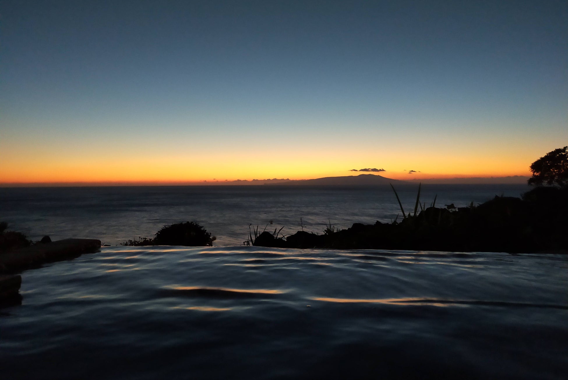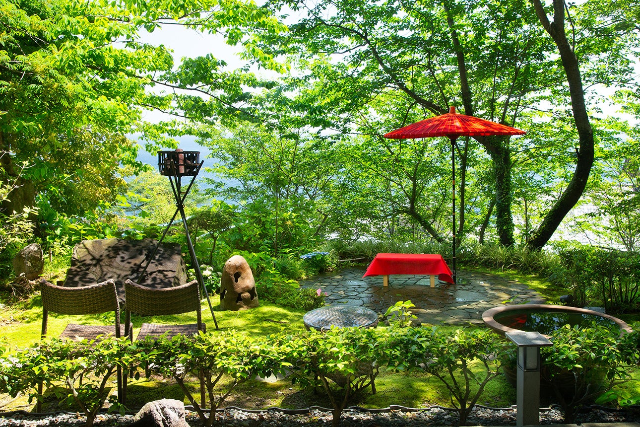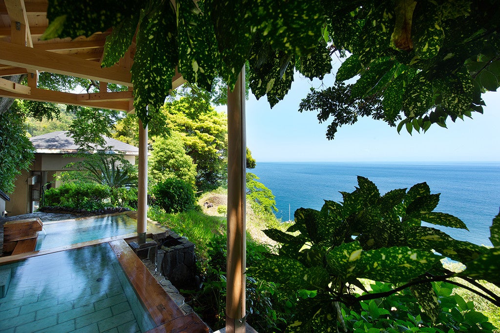 ウェルカムパンケーキのアフタヌーンティーの後は、海と空と緑に囲まれた露天風呂で自家源泉かけ流しの湯を堪能しましょう。