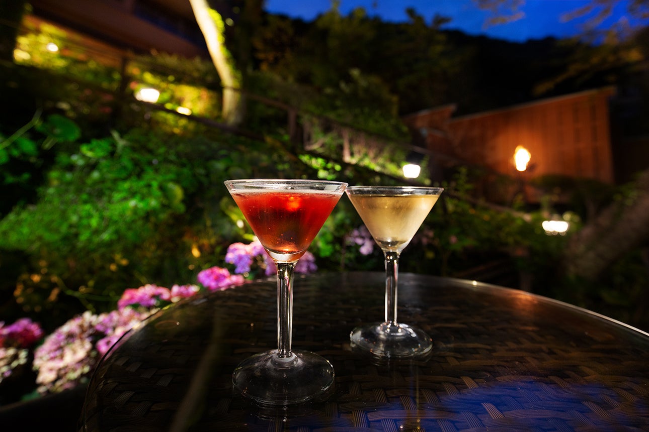 夕方のアペリティフタイムはガーデンテラスにて、夏季限定ニューサマーオレンジなどのフローズンカクテルで湯上りの夕涼み。
