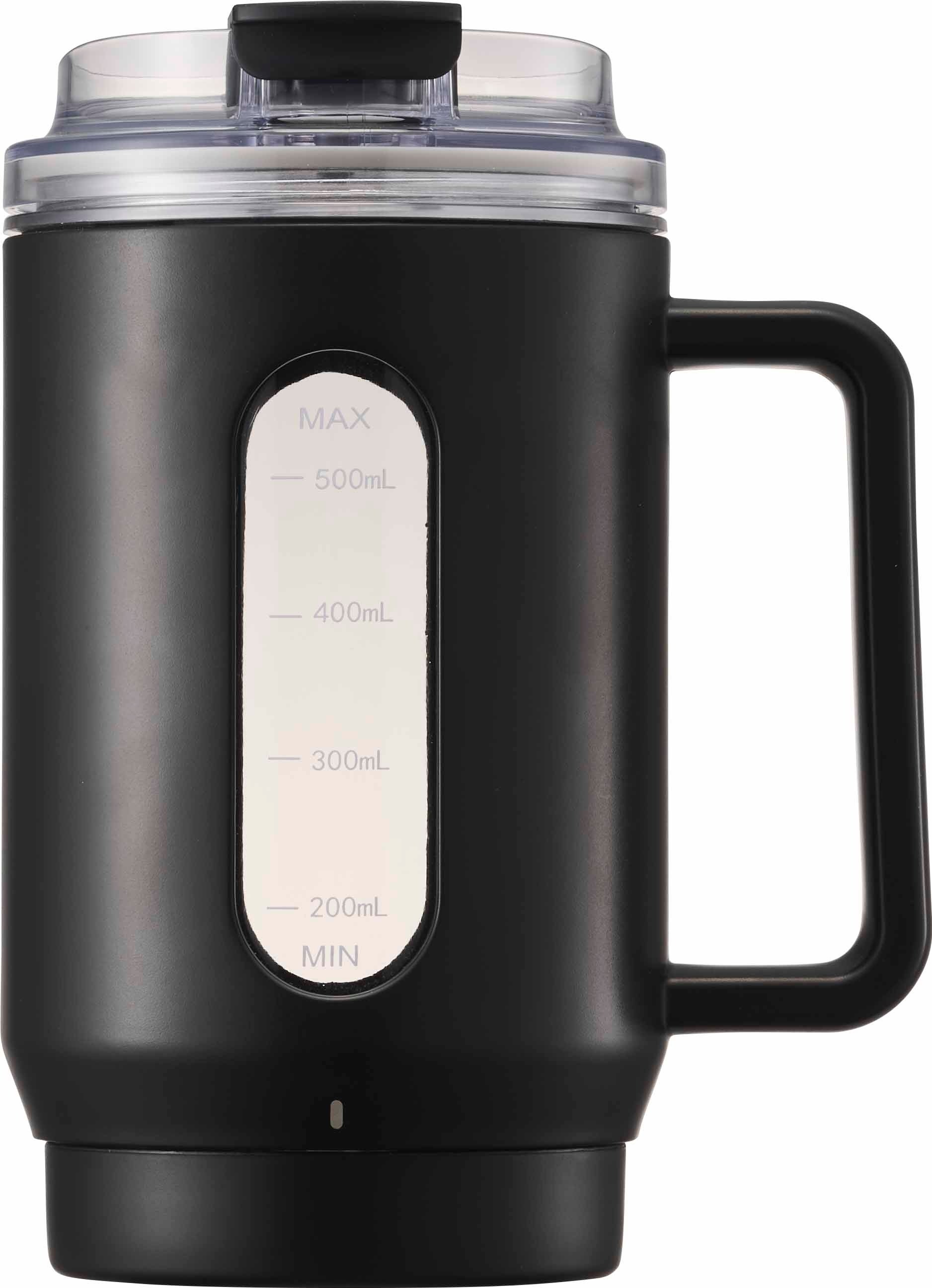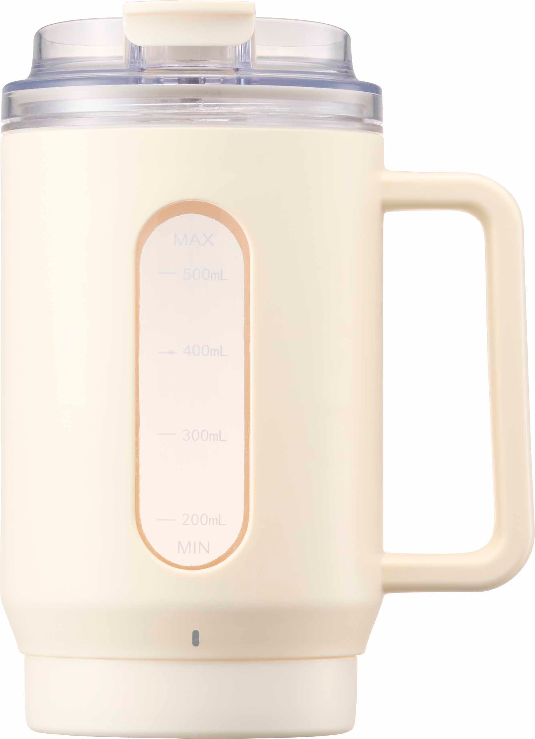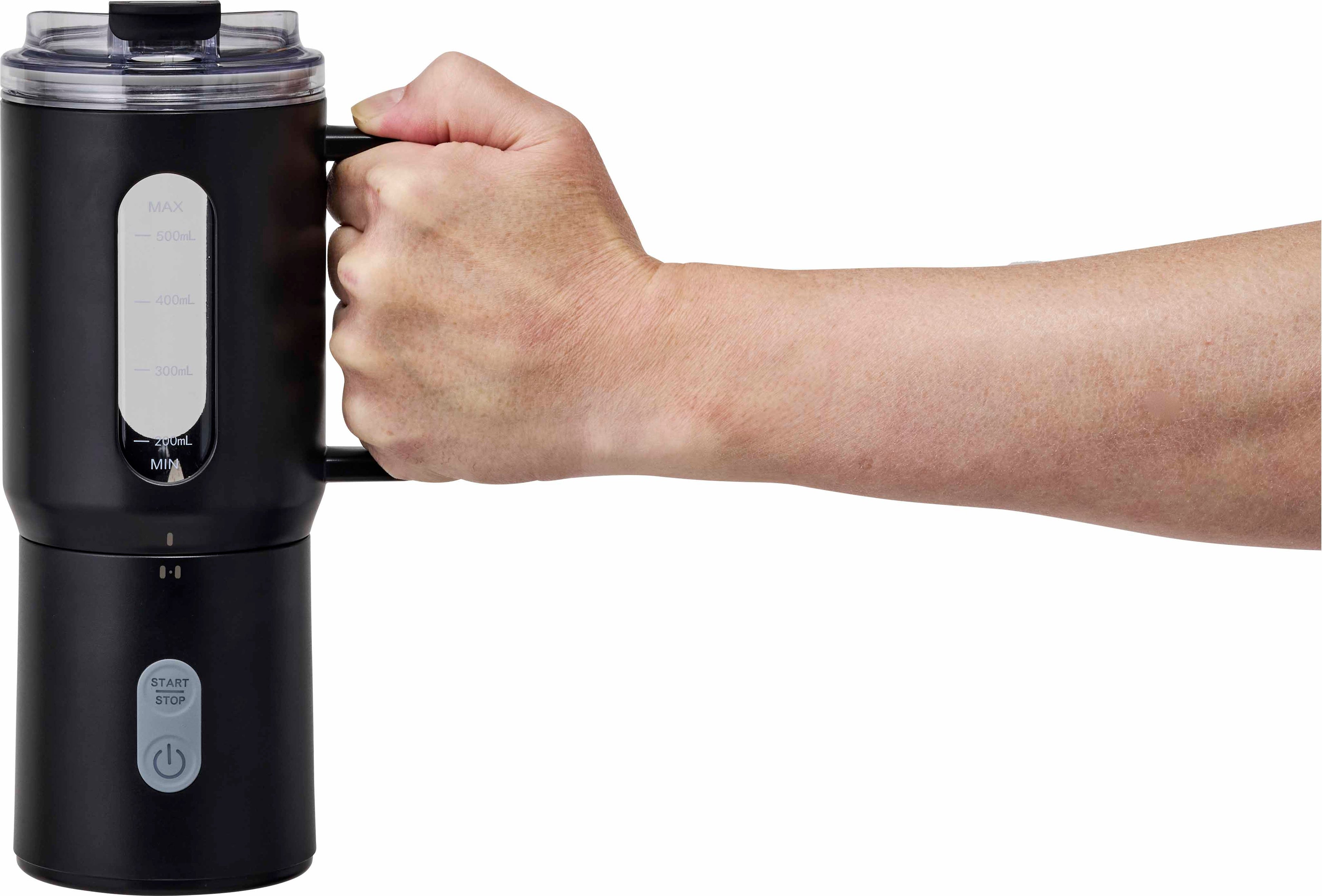取っ手付きタンブラー型で、家の中はもちろん、外出先やオフィスにも気軽に持ち運びしやすいデザインです。また、モーター部分は本体下部に配置しているため、攪拌後は本体から取り外して下フタを取り付けることで、マグジョッキのように飲むことも可能です。
