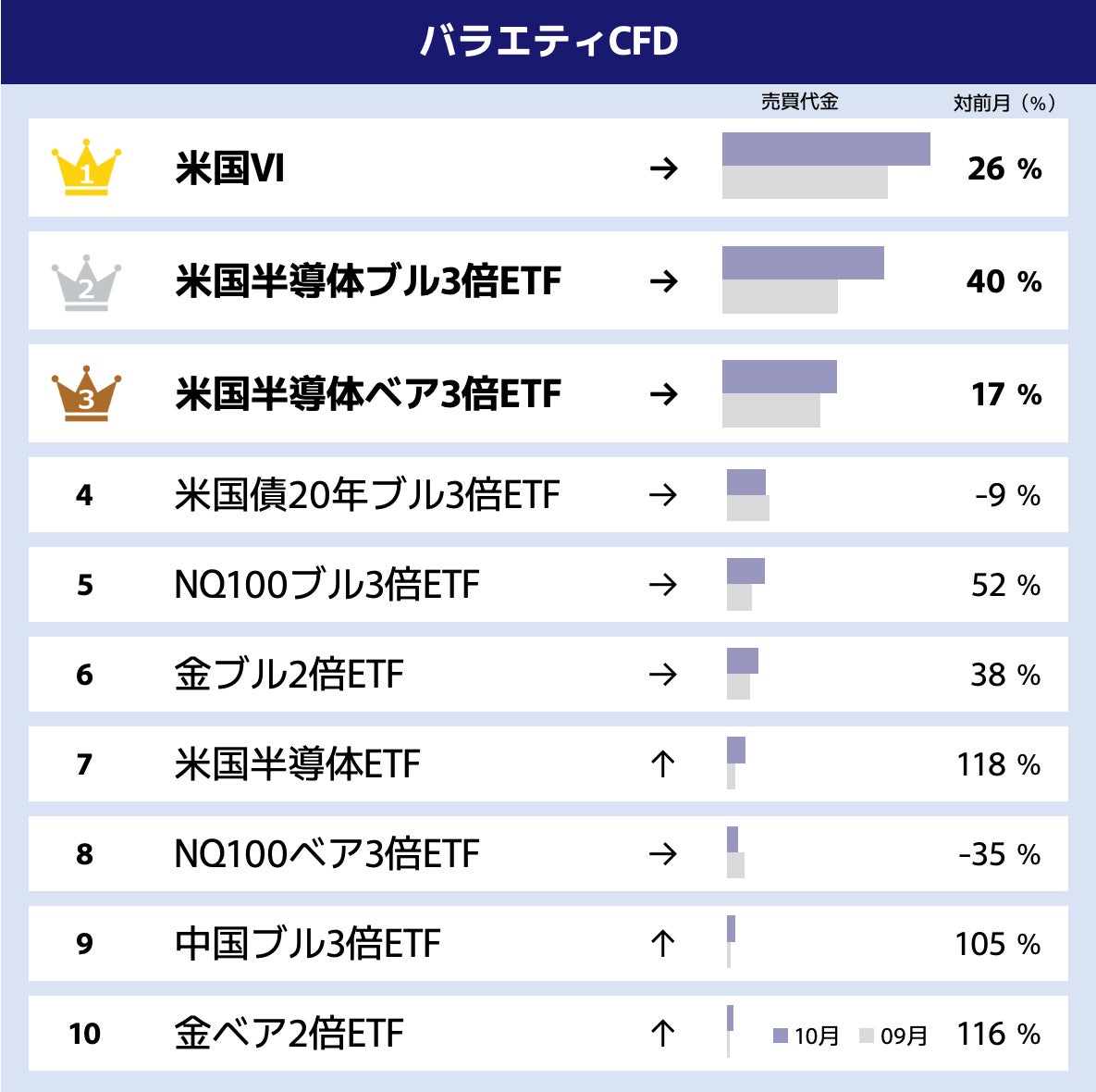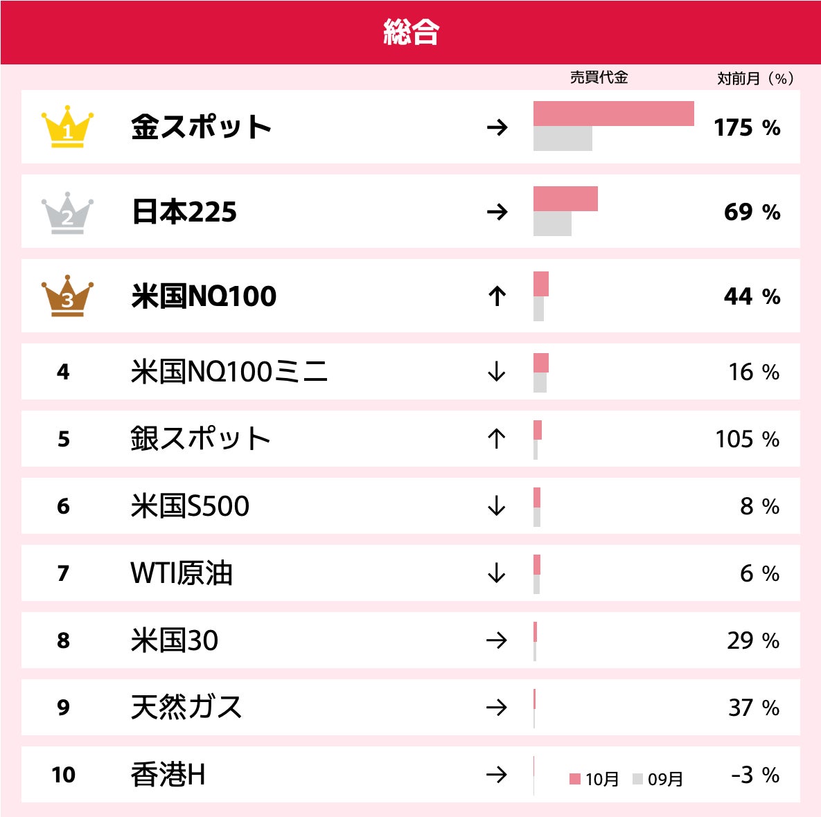 また、10月の日本株式市場は政治イベントを背景に株高が進み、財政拡張路線への期待から日経平均株価が大きく上昇しました。日経平均は史上初の5万円台を突破し、月間の上げ幅は過去最高を記録しました。この結果、当社の株価指数CFD「日本225」の売買代金は前月比1.7倍に増加し、総合ランキングの2位にランクインしました。