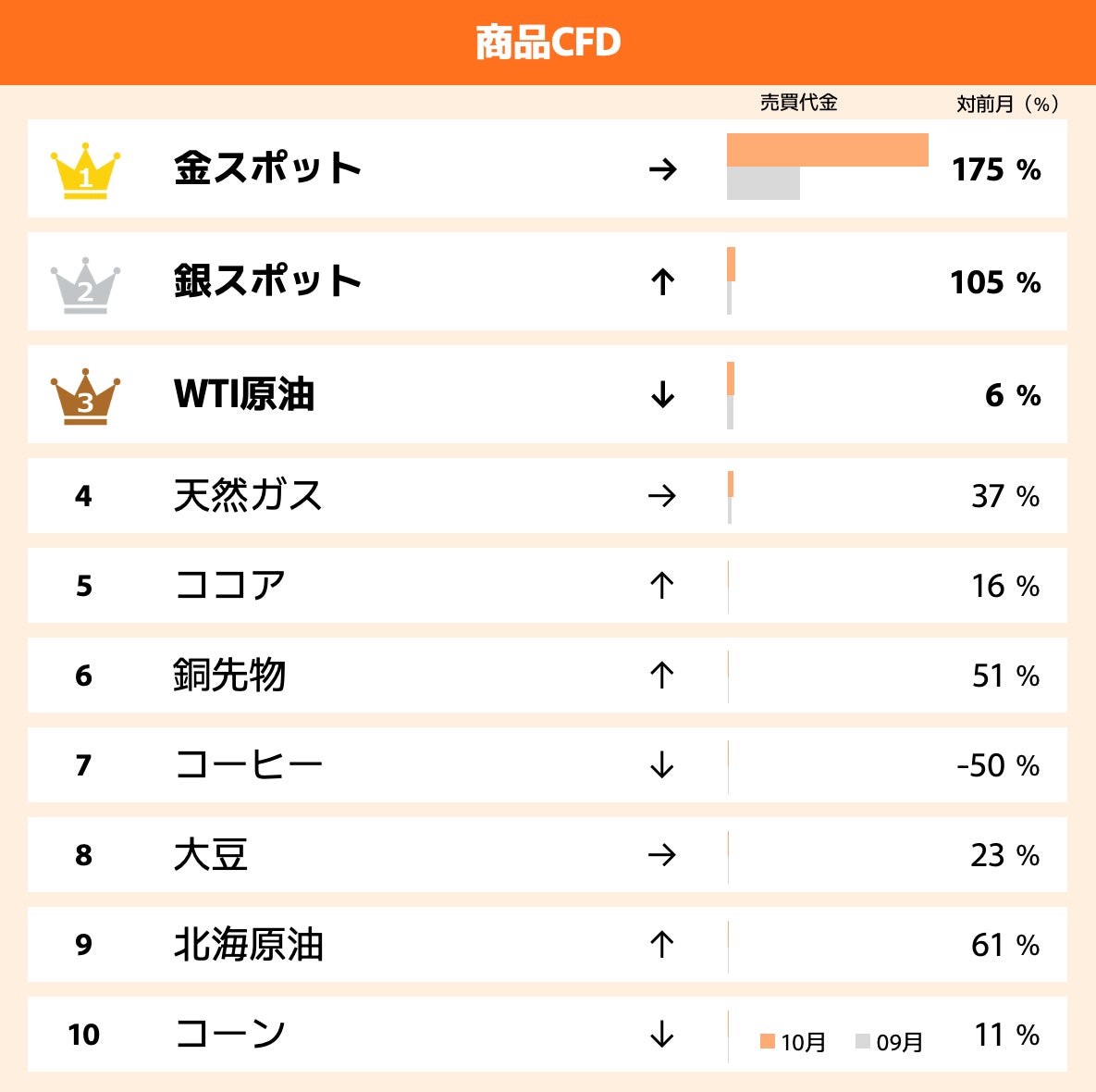 ~総合・商品CFDの首位は金スポット!バラエティCFDは米国VI、外国株CFDはテスラが首位に~