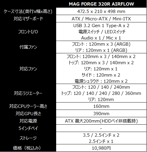 ■製品URL:https://jp.msi.com/PC-Case/MAG-FORGE-320R-AIRFLOW