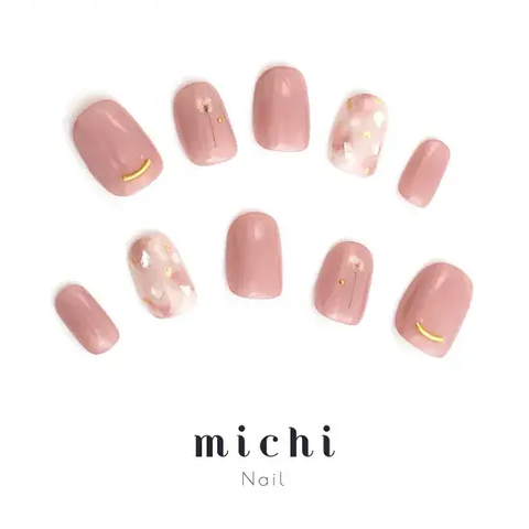 肌なじみの良いくすみピンクをベースに、繊細な押し花とシェルをあしらった上品で大人可愛いデザイン。ゴールドのワンポイントが指先にさりげない華やかさをプラスしてくれます。