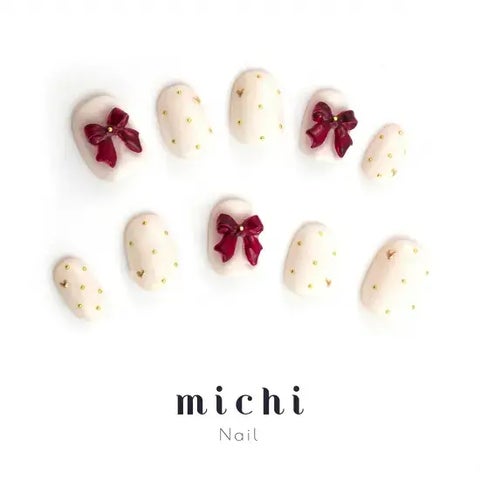 大きなボルドーリボンが特徴のかわいらしいネイルです。ゴールドのドットが煌めき、ガーリーな印象を与えてくれます。デートや女子会におすすめです。