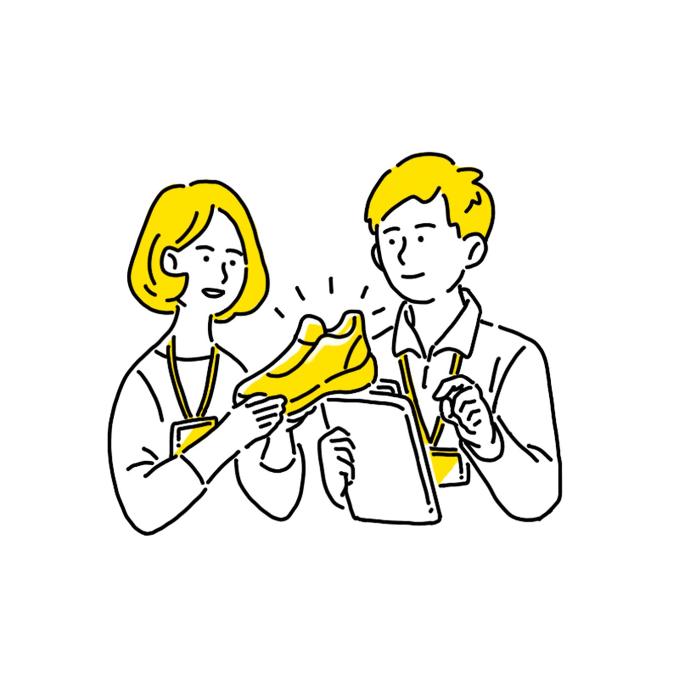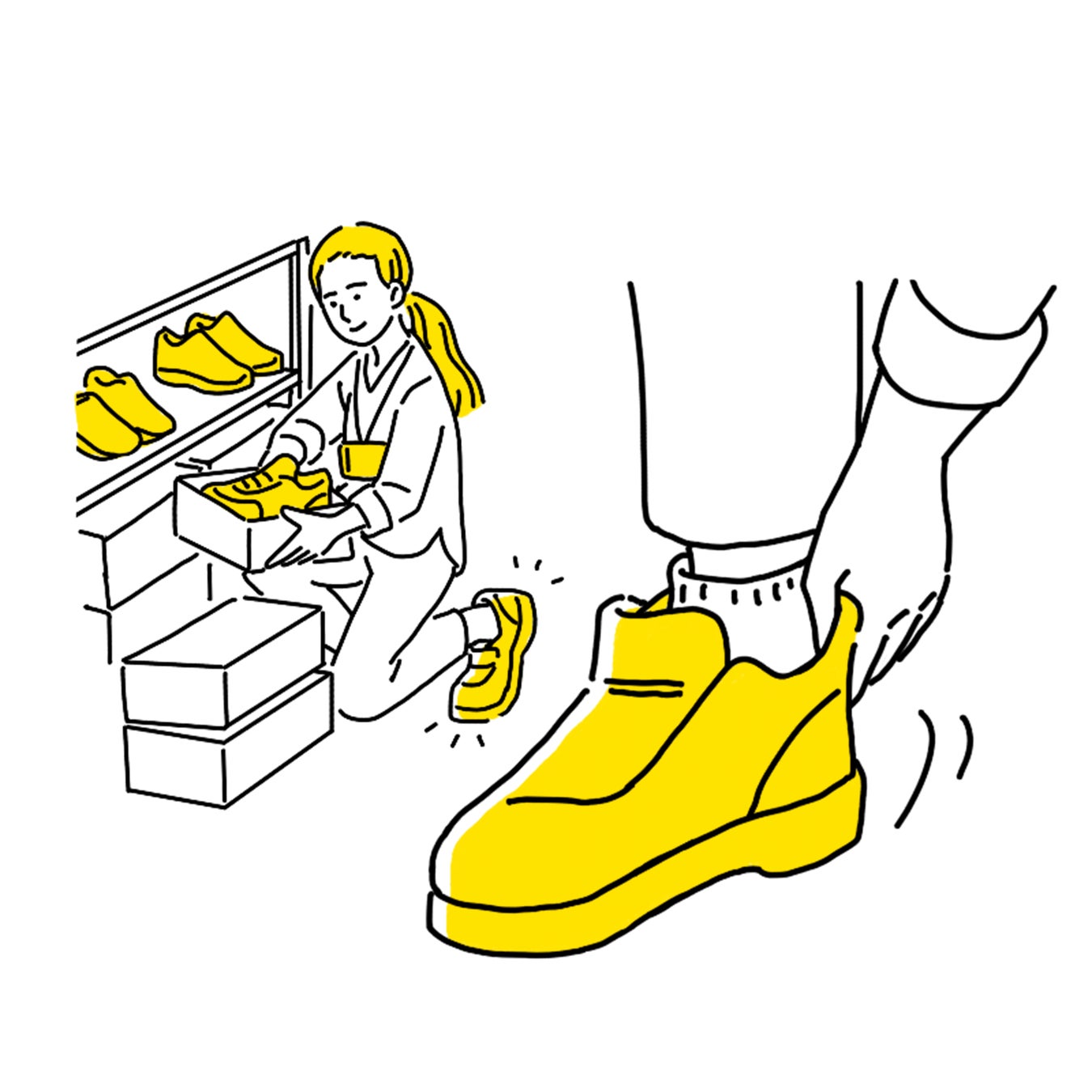 年間平均3,000人のお客様を対応する店舗スタッフが、日々の業務の中で商品を着用し、一定期間継続して着用して、合計100万歩に及ぶ検証を実施。接客時の動作や長時間の歩行といったリアルな使用環境の中で、得られた体感や意見をもとに改良を重ねています。