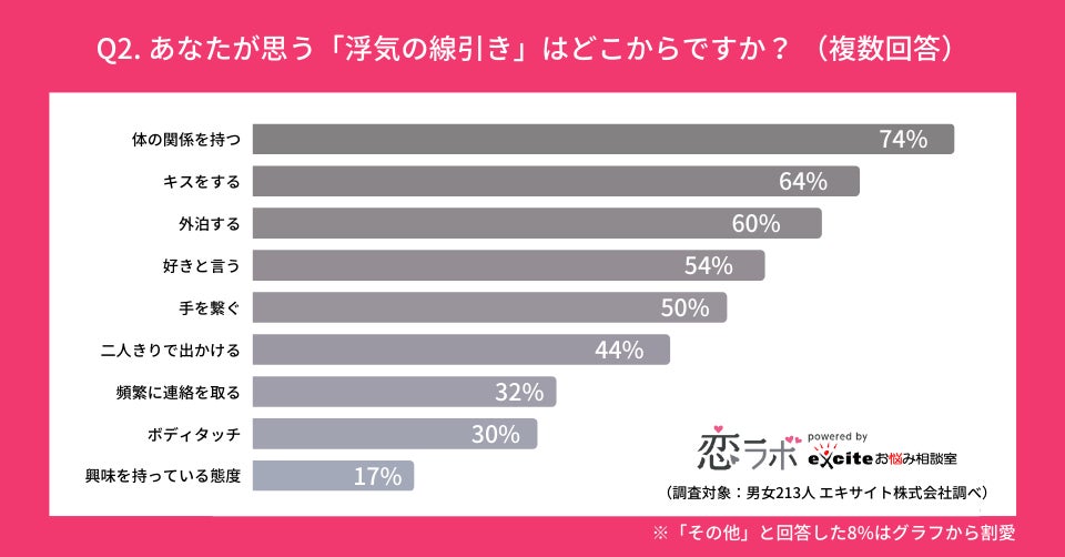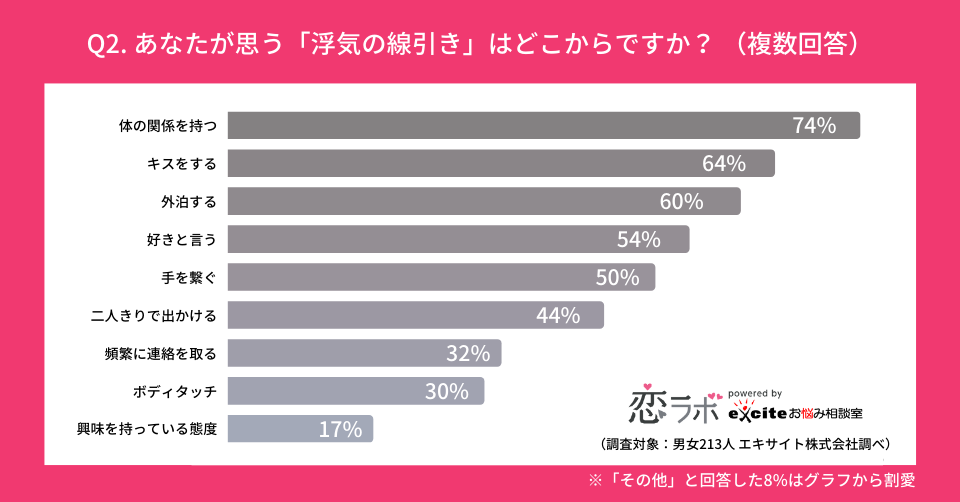 エキサイト株式会社(所在地:東京都港区、代表取締役社長:西條晋一)が運営する、恋愛相談に特化した国内最大級(※1)のオンライン恋愛相談サービス「恋ラボ」は、男女213名に対し「浮気の定義」に関するアンケート調査を実施しました。
