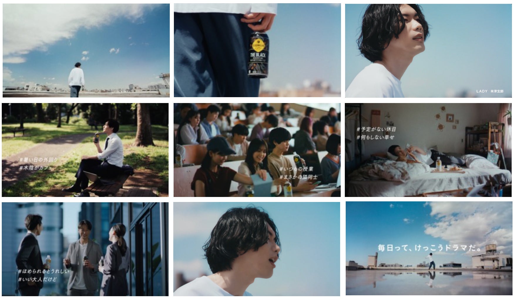 「ジョージア」を片手にビルの屋上を歩く、米津玄師さん。「コーヒーを飲んで、ふと思った。普通の一日なんて、きっとない。」という米津さんのナレーションが流れ、書き下ろし楽曲「LADY」を歌う米津さんの姿をきっかけに、さまざまな登場人物の日常が展開されていきます。仕事中、ちょうど良い木陰を見つけて少し気を緩める休憩タイムや、いつもの授業で、偶然にも気になる人と隣り合わせになれた瞬間など、画面には、些細な日常の出来事が“かけがえのない瞬間である”ということを表すハッシュタグがシーンに合わせて表示されていきます。続けて、“なにもしないことの幸せ”を噛み締める予定のない休日、仲間に褒められて嬉しかったある日の会議などが流れていき、「コーヒーを飲んでふと思った、なんでもない私の、なんでもない日々だけど、“毎日って、けっこうドラマだ。”」と、「ジョージア」のブランドキャンペーンメッセージ、そして米津さんによる「ジョージア」という一言で締めくくられます。