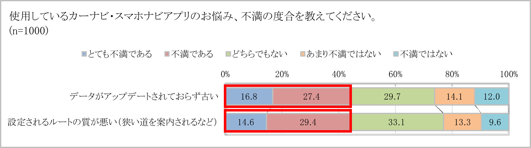 ■カーナビやスマートフォンのナビアプリに対し、「データのアップデートがされていない」「ルートの質が悪い」点に不満を感じているドライバーが4割以上。