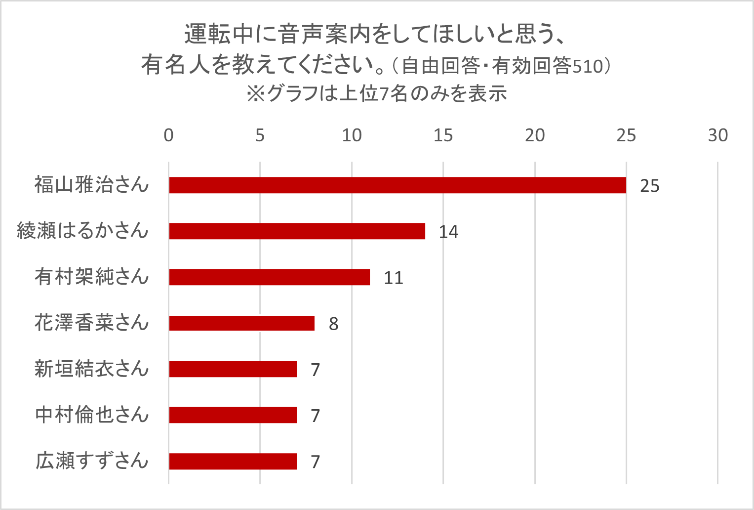 運転中に音声案内をしてほしいと思う有名人の質問では、1位に福山雅治さん(25票)、2位は綾瀬はるかさん(14票)、3位は有村架純さん(11票)という結果になりました。また、87名が「声優」や声優名を回答しており、声優ボイスによる音声案内のニーズが高いこともわかりました。