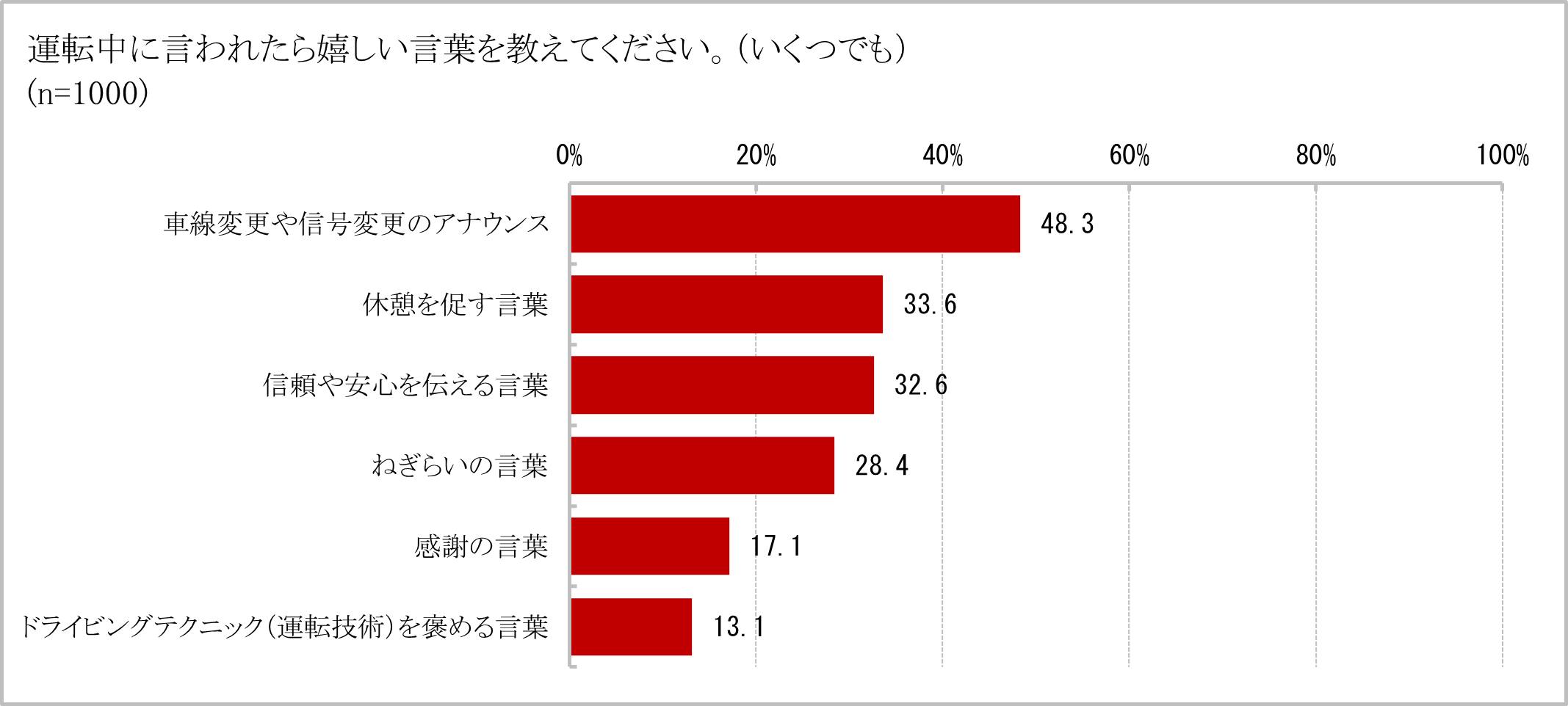 ■運転中に助手席から言われたら嬉しい言葉の第1位は、「車線変更や信号変更のアナウンス」。