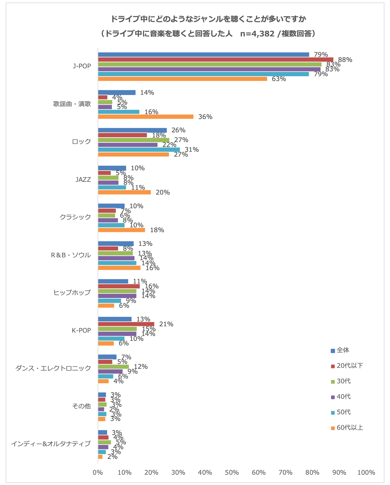 年代別に見ると、20代以下・30代・40代では「K-POP」がTOP3にランクイン。一方、50代・60代以上では「歌謡曲・演歌」の人気が高く、年代による嗜好の違いが見られました。また、「J-POP」「ロック」は全ての年代でTOP3に入り、ドライブ中の音楽として世代を問わず幅広く支持されているようです。