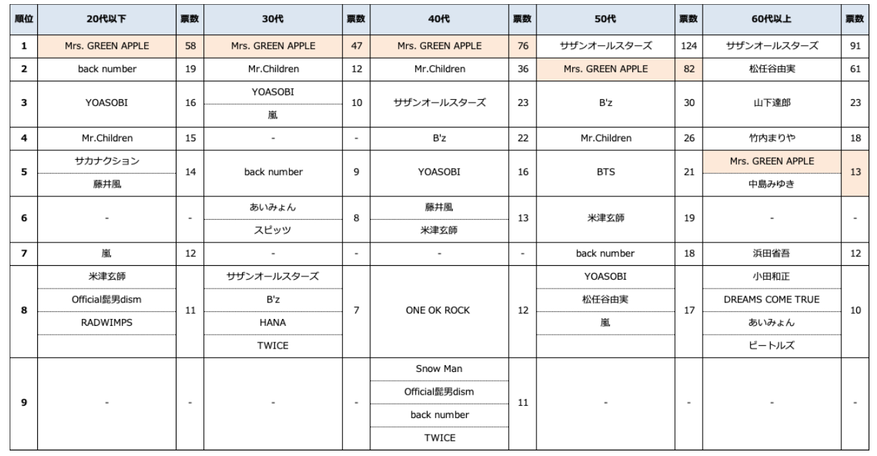 ③ ドライブ中に最もよく聴くミュージシャン全体1位は「Mrs. GREEN APPLE」、唯一全年代でランクイン!
