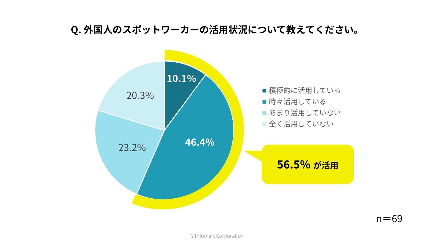 スポットワーカーを「現在活用している」と回答した方に、外国人のスポットワーカーの活用状況を聞いたところ(n=69)、「積極的に活用している」は10.1%、「時々活用している」は46.4%で、合計すると56.5%が活用していることが分かりました。