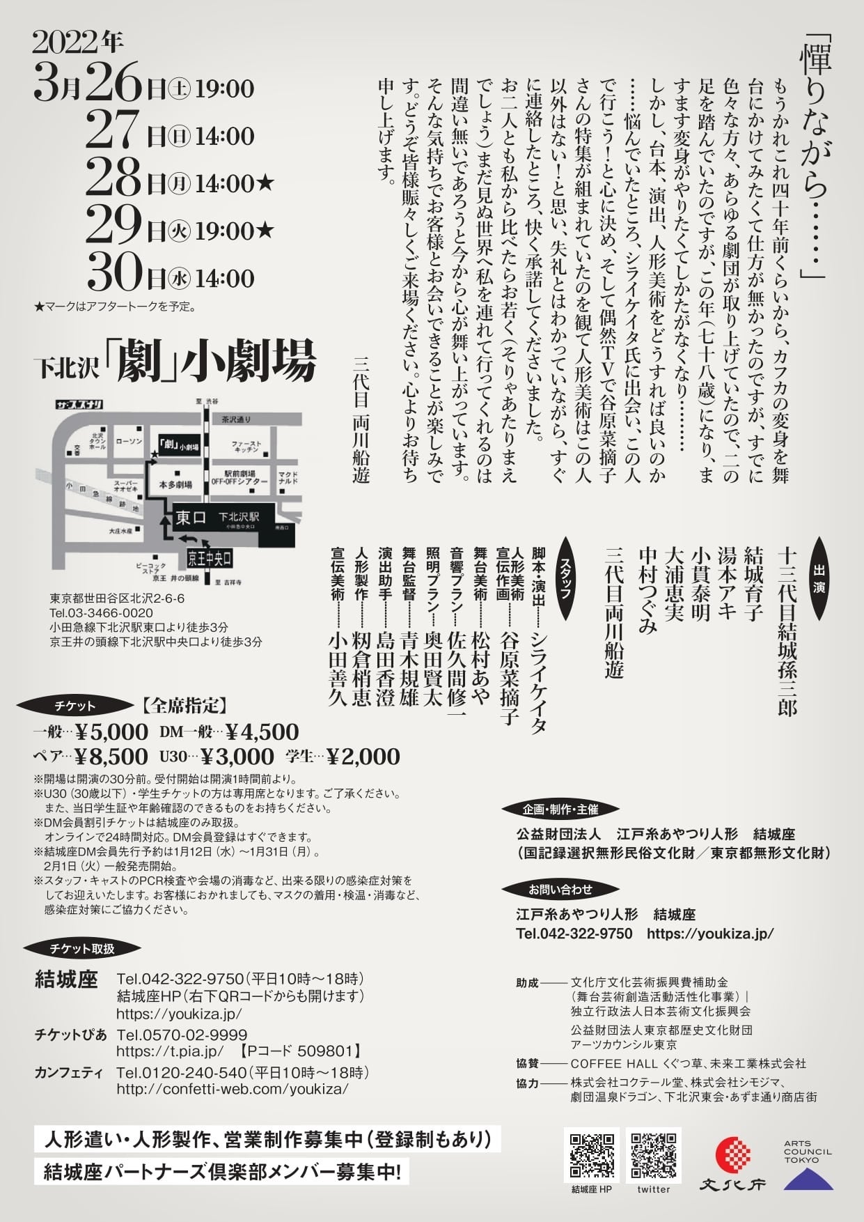 江戸糸あやつり人形 結城座(東京都小金井市、代表:三代目両川船遊)主催による結城座旗揚げ385周年記念公演第三弾『変身』が2022年3月26日(土)~3月30日(水)に「劇」小劇場(東京都世田谷区)にて上演されます。チケットはカンフェティ(運営:ロングランプランニング株式会社、東京都新宿区、代表取締役:榑松 大剛)にて2月1日(火)発売開始予定です。