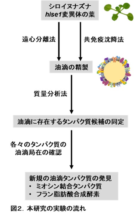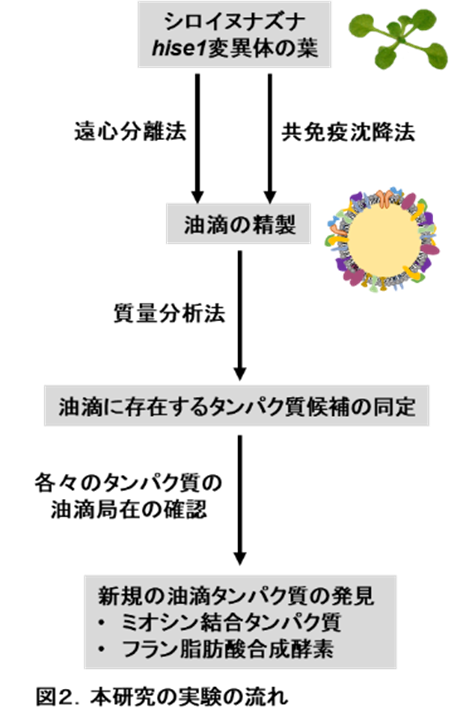 葉の油滴に存在するタンパク質を網羅的に調べるために、研究チームは実験材料に用いる植物(シロイヌナズナ(注3))と、油滴の精製方法の確立を目指しました(図2)。通常、シロイヌナズナの葉には油滴が少量しか存在しないので、油滴を精製して解析するのが困難です。そこで、実験材料として、葉に油滴を過剰蓄積するシロイヌナズナのhigh sterol ester 1(hise1)変異体(注4)を用いることで、油滴の単離が非常に簡便になりました。また、油滴を効率よく単離するために、研究チームは遠心分離法(注5)を用いた方法と、共免疫沈降法(注6)を利用する方法の2種類を確立しました(図2)。