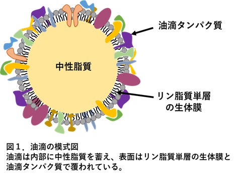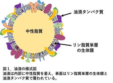 研究チームは以前より、脂質の貯蔵に関わる細胞小器官(注1)である油滴(図1)に着目しています。油滴はナタネやゴマなどの油糧種子(注2)の細胞に非常に多く存在し、発芽のためのエネルギー源として脂質を貯蔵しています。私たち人間にとっても、油糧種子の油滴に蓄えられた脂質は、サラダ油などの食料資源や、バイオ燃料などの工業資源として非常に重要です。そのため、これまでの油滴の研究は油糧種子を中心に進められてきました。