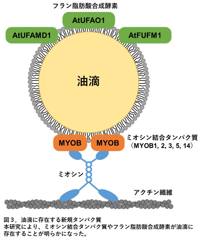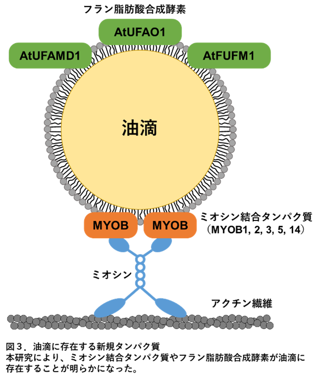 これらの候補のなかから、研究チームは、実際に油滴に存在する新規のタンパク質を発見することにも成功しています。まず、そのひとつがミオシン結合タンパク質(myosin-binding protein, MYOB)です(図3)。ミオシンは、細胞骨格であるアクチン繊維注8)の上を動く機能をもつタンパク質であり、細胞小器官が細胞内を移動するために必要です。ミオシン結合タンパク質はその名の通り、ミオシンに結合するタンパク質のひとつで、シロイヌナズナは16種類のミオシン結合タンパク質を持つことが分かっていますが、そのうちの5種類(MYOB1, 2, 3, 5, 14)が油滴に存在することが分かりました。ミオシン結合タンパク質の機能には未解明の部分も多く残っていますが、研究チームは今回、葉の油滴がアクチン繊維に沿って動く様子を捉えることに成功しました。つまり、葉の油滴はミオシン結合タンパク質を介して、細胞内を動くことが示唆されました。