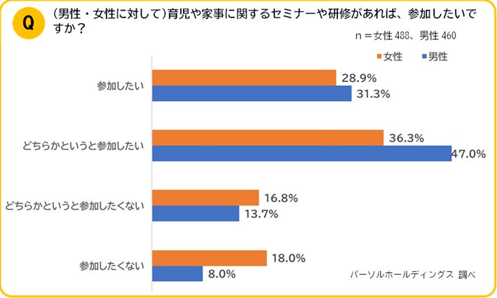 育児および家事に関するセミナーや研修があれば参加したいかと聞いたところ、男性の約8割が参加を希望。女性も65.2%の約7割が参加したいと答えました。フリーコメントでは、育児に必要な知識の教育、効率よくお互い家事分担ができるために心得、子どもの成長に合わせた食事の準備などについて学べる研修を希望するなどの声がありました。