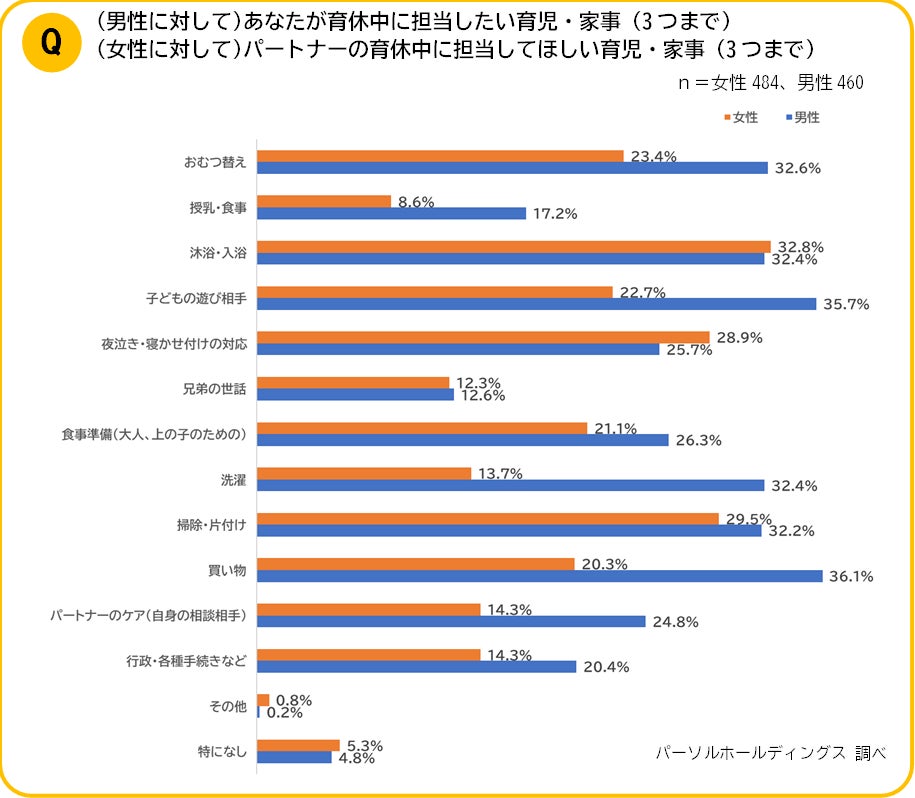 男性に「育休期間中に担当したい(担当する)育児・家事」を質問したところ、上位に「買い物」、「子どもの遊び相手」、「おむつ替え」が並んだ一方、女性は「沐浴・入浴」「掃除・片付け」、「夜泣き・寝かせ付けの対応」が並ぶ結果となりました。育児や家事におけるパートナー間でしっかり話し合い、互いに期待している役割について共有することが大事であることが分かります。