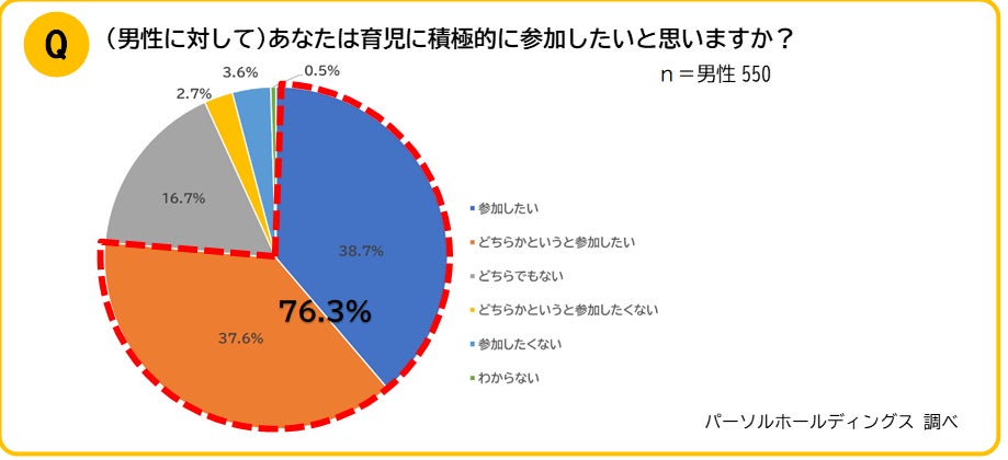 男性に対して「育児に積極的に参加したいと思いますか?」とたずねると「育児に参加したい」が全体の76.3%と4人に3人までの男性が育児への参加を望んでいることが分かります。