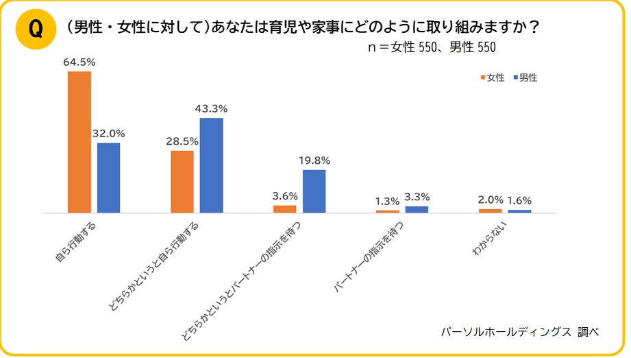 男性の4人に3人が育児に積極的に参加したいと回答するも、育児に関して「パートナーの指示を待つ」と答えた方は23.1%。