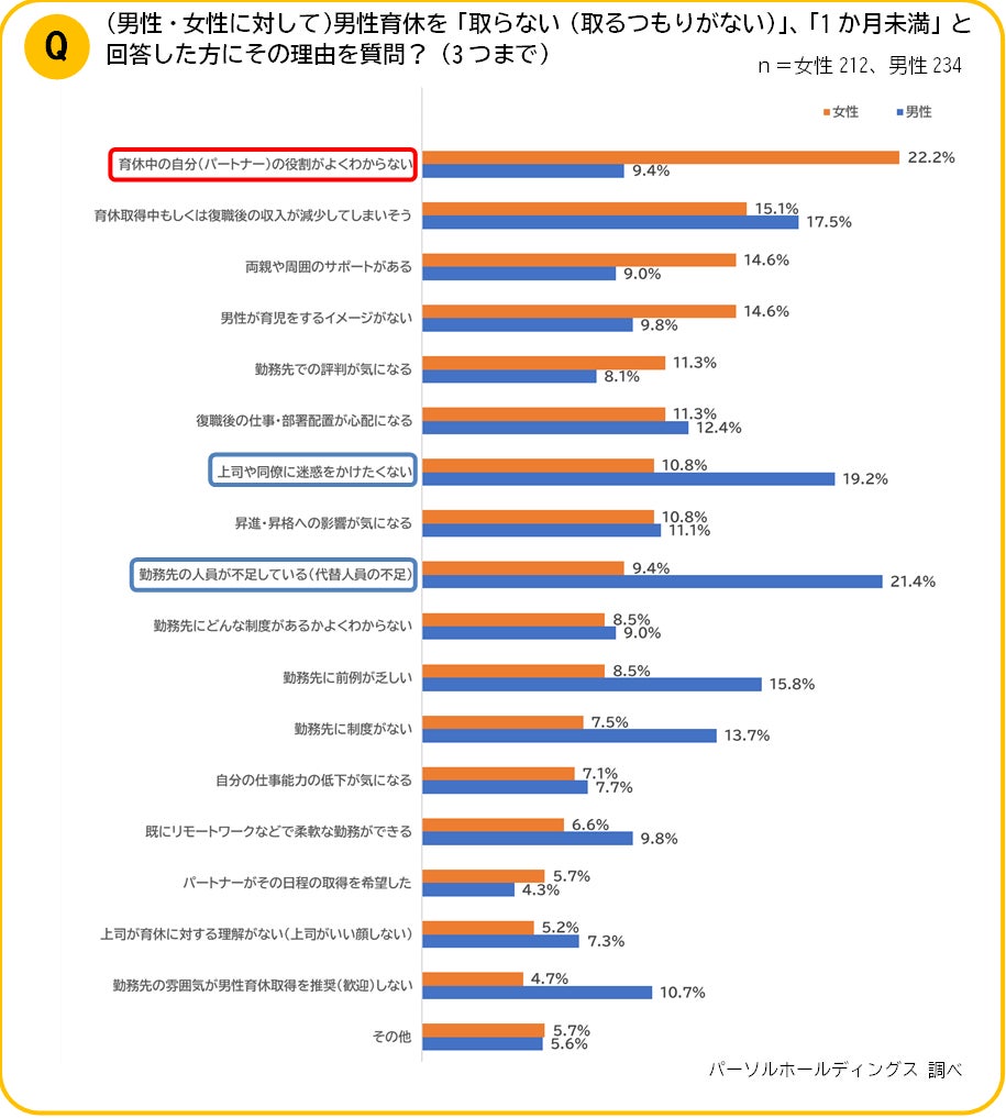一方の女性は「育休中のパートナーの役割がよくわからない」がトップで22.2%、「パートナーの育児をするイメージがない」も14.6%と、男性の「取るだけ育休」や「指示待ち育休」を懸念していると考えられます。
