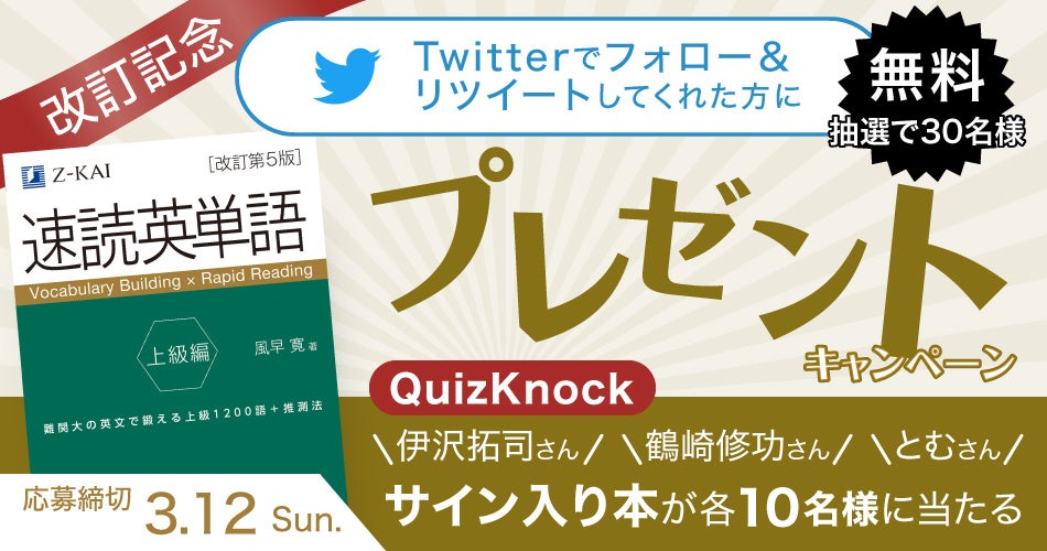 プレゼント書籍は、QuizKnock 伊沢拓司さん、鶴崎修功さん、とむさんのいずれかのサイン入り!
