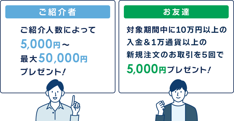 すでに『外貨ネクストネオ』を開設しているお客様(「ご紹介者様」)が、『外貨ネクストネオ』に興味をお持ちの方(「お友達」)を紹介していただき、後日その「お友達」が条件(『外貨ネクストネオ』にて10万円以上の入金(※1)、および1万通貨以上の新規取引を5回以上)を満たされた場合には、「ご紹介者様」と「お友達」の双方にもれなく現金5,000円をプレゼントいたします。