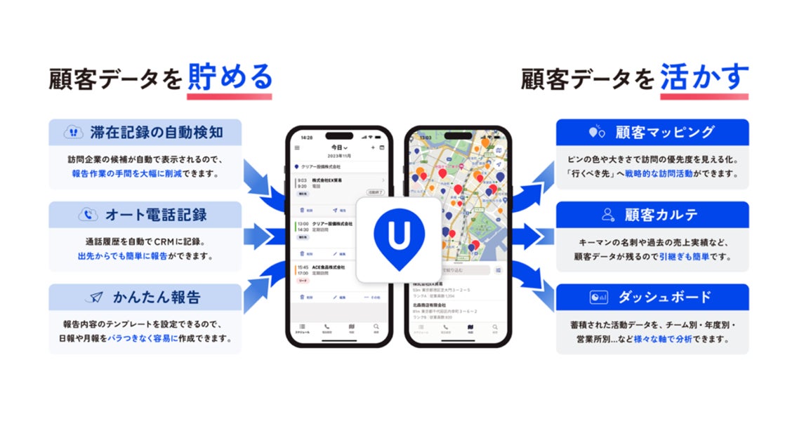 「UPWARD」は高度な位置情報技術を活かし、営業活動データを半自動でCRMに検知・記録し、現場の営業担当者の営業活動を最適化するセールスエンゲージメントサービスです。フィールドワーカーの業務を効率化することで創造性を引き出し、企業と社会の成長を後押しします。