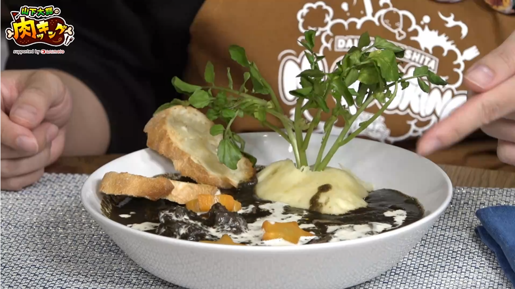 今回のメニューは、Knightsの楽曲『Checkmate Knights』にちなんだ、「チェックメイト!白と黒のビーフシチュー」です。“フェアリーゴッドマザー“こと料理家の藤岡真理子氏が優しい声でメニュー解説を行い、「せーの、レッツ肉ッキング!!」のかけ声で料理スタート。土田は料理が得意ですがカメラの前でするのは初めてとのことで、緊張しています。まずはみじん切りにした玉ねぎと舞茸とパイナップルで肉をつけこみつつ、野菜を強火で炒めます。袋のままレンチンしたジャガイモをつぶして揉んでマッシュポテトを作りながら、メインのお肉をしっかり焼いてコーラで煮込み、黒ゴマをといた真っ黒なデミグラスソースを加えて更に煮込みます。途中、Knightsメンバーで一緒に料理をしたらという妄想コントや、最近山下がホルモンが食べられるようになった話、土田の出身地、北海道の美味しい野菜の話などで盛り上がり、和気あいあいと調理が進んでいきます。炒めた野菜を入れ忘れるトラブルはありつつ、揉んだままのじゃがいもが山下によりドスンとお皿に盛られ、なんともワイルドなマッシュポテトと、漆黒のビーフシチューに生クリームをかけて「白と黒のビーフシチュー」のできあがり。