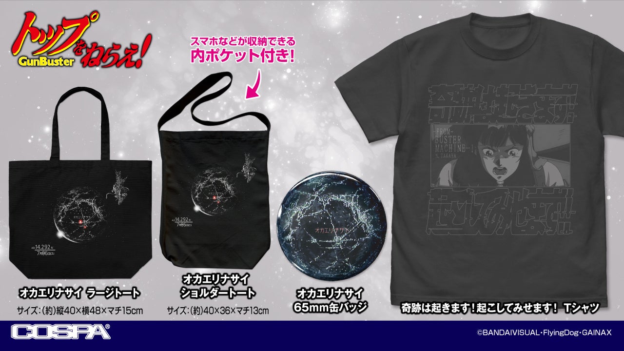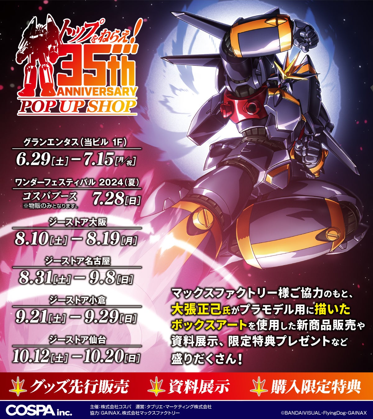 公式キャラクターコスチュームやアパレル・グッズの企画、開発、製造を行う株式会社コスパ(所在地:東京都渋谷区、代表取締役:松永芳幸)は、グランエンタス(秋葉原オノデン1F)を皮切りに『トップをねらえ!』35th ANNIVERSARY POPUP SHOPを全国巡回をする。